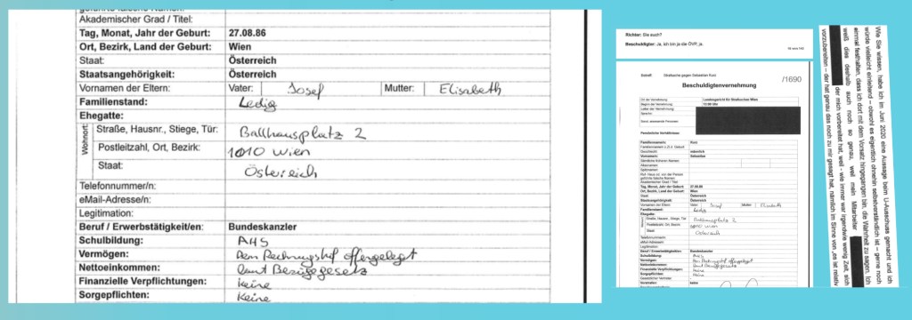 Es soll sogar Klügsten in für sie recht angespannten Situationen recht schwerfallen, zwischen Wohnort und Arbeitsplatz unterscheiden zu können. Und, es kann verstanden werden, daß die Beschuldigte – ist es doch nicht ihr tatsächlicher Wohnort, an dem sie hauptgemeldet ist – beinahe eine falsche Postleitzahl hingegeschrieben hätte, nämlich „1110“ statt „1010“. Die richtige Postleitzahl fällt der Beschuldigten dann doch irgendwie noch ein, und so überschreibt die Beschuldigte die falsche „1“ mit der richtigen „0“.