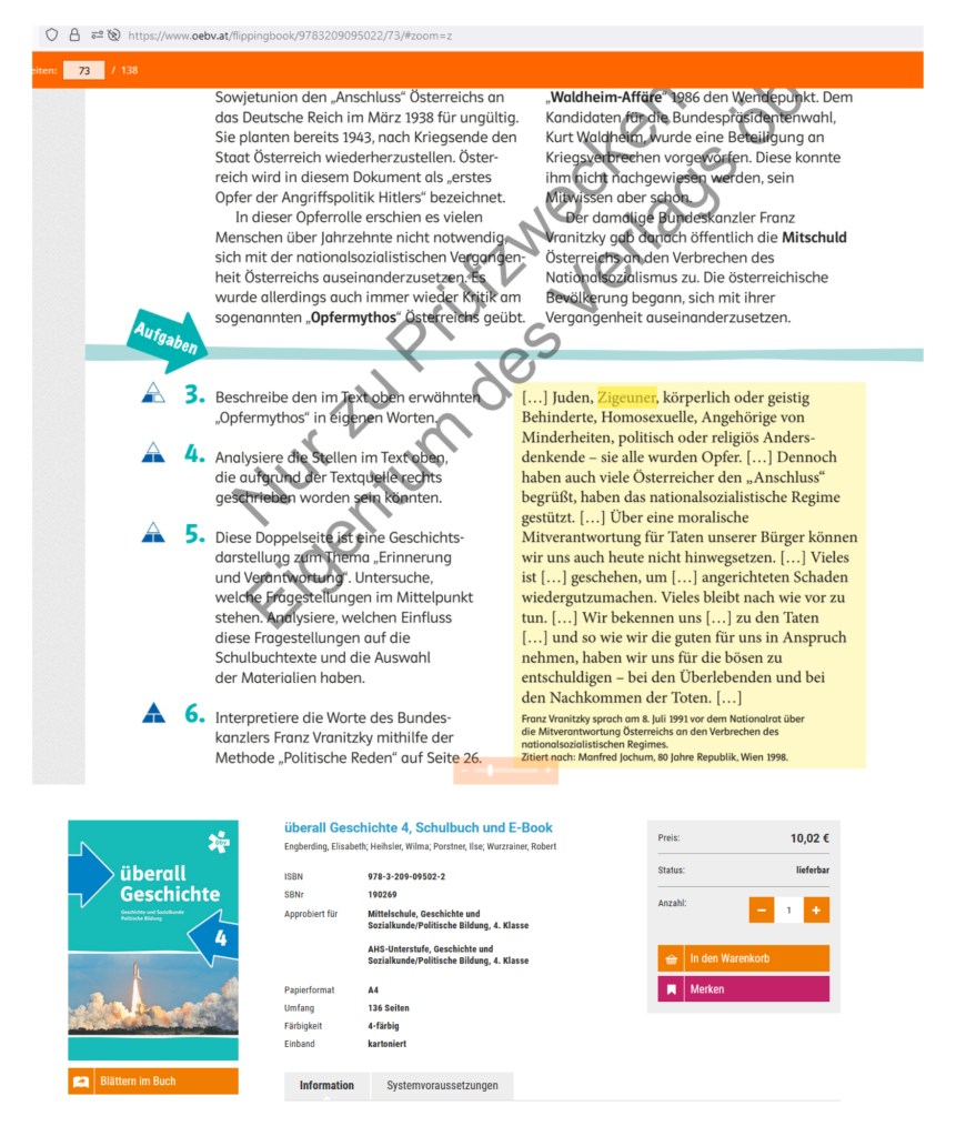 Das Besondere an diesem seit mehr als zwei Jahren zum Unterrichtsgebrauch geeignet erklärten Schulbuch ist der besondere Einsatz und der besondere Nicht-Einsatz von Anführungszeichen bei den Wörtern Anschluß und Zigeuner. Wie das Wissensnetz Österreich Zigeuner nicht in Anführungszeichen setzt, sehr wohl aber Anschluß in Anführungszeichen setzt, setzen Elisabeth Engberding, Wilma Heihsler, Ilse Porstner, Robert Wurzrainer in ihrem Lehrbuch Anschluß in Anführungszeichen, nicht aber in Anführungszeichen setzen sie Zigeuner.
