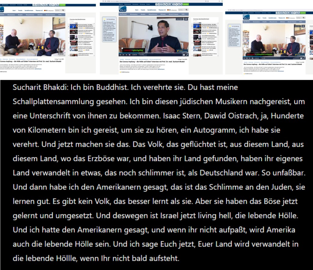 Sucharit Bhakdi: Ich bin Buddhist. Ich verehrte sie. Du hast meine Schallplattensammlung gesehen. Ich bin diesen jüdischen Musikern nachgereist, um eine Unterschrift von ihnen zu bekommen. Isaac Stern, Dawid Oistrach, ja, Hunderte von Kilometern bin ich gereist, um sie zu hören, ein Autogramm, ich habe sie verehrt. Und jetzt machen sie das. Das Volk, das geflüchtet ist, aus diesem Land, aus diesem Land, wo das Erzböse war, und haben ihr Land gefunden, haben ihr eigenes Land verwandelt in etwas, das noch schlimmer ist, als Deutschland war. So unfaßbar. Und dann habe ich den Amerikanern gesagt, das ist das Schlimme an den Juden, sie lernen gut. Es gibt kein Volk, das besser lernt als sie. Aber sie haben das Böse jetzt gelernt und umgesetzt. Und deswegen ist Israel jetzt living hell, die lebende Hölle. Und ich hatte den Amerikanern gesagt, und wenn ihr nicht aufpaßt, wird Amerika auch die lebende Hölle sein. Und ich sage Euch jetzt, Euer Land wird verwandelt in die lebende Höllle, wenn Ihr nicht bald aufsteht.