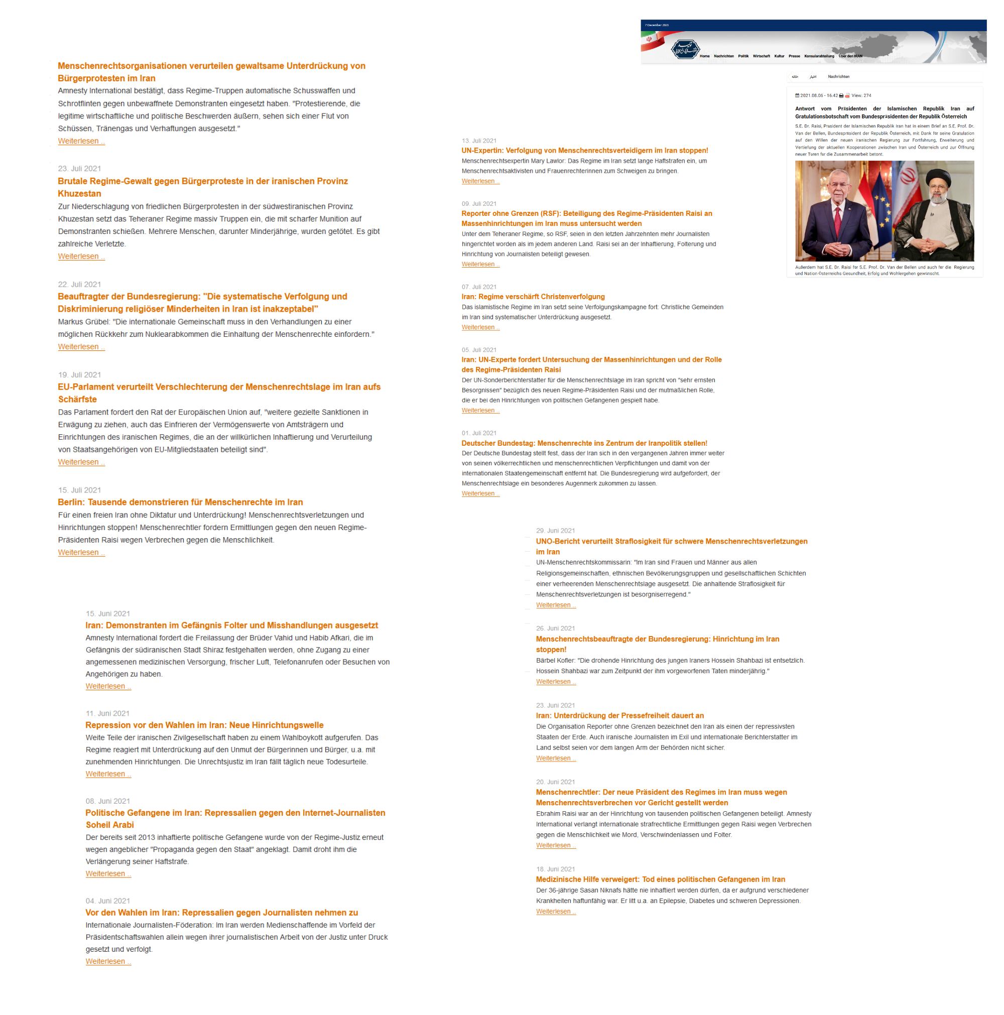 Und was für Erfolge zeitigen seine Wünsche? Es sind deren so viele, daß diese hier gar nicht aufgezählt werden können. So wurde entschieden, in einer Collage all die Erfolge allein schon in diesem letzten Halbjahr 2021 nur mittels Überschriften zu listen. Beeindruckend, wie die Wünsche des Alexander Van der Bellen, einfach wie kurz gesagt, so rasch in Erfüllung gehen: Spannungen zu deeskalieren, zu stabilisieren, gute wirtschaftliche Bedingungen und die Grundrechte der Freiheit zu gewährleisten.