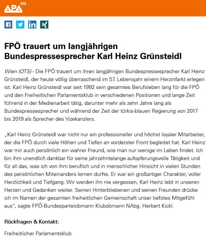Karl Heinz Grünsteidl war nicht nur ein professioneller und höchst loyaler Mitarbeiter, der die FPÖ durch viele Höhen und Tiefen an vorderster Front begleitet hat. Karl Heinz war mir auch persönlich ein wahrer Freund, wie man nur wenige im Leben findet. Ich bin ihm unendlich dankbar für seine jahrzehntelange aufopferungsvolle Tätigkeit und für all das, was ich von ihm beruflich und in menschlicher Hinsicht in vielen Stunden des persönlichen Miteinanders lernen durfte. Er war ein großartiger Charakter, voller Herzlichkeit und Tiefgang.