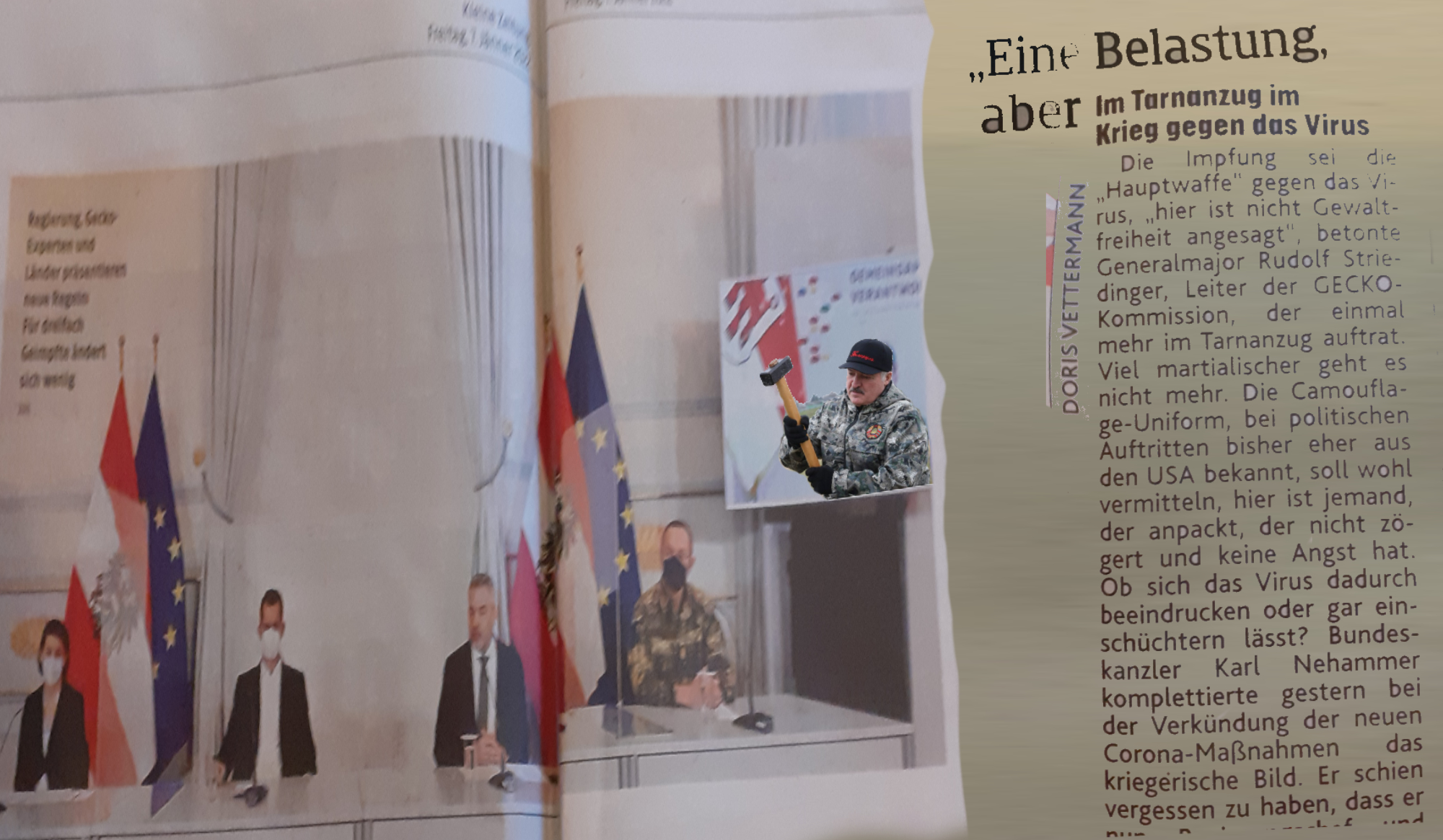 Die Impfung sei die „Hauptwaffe“ gegen das Virus, „hier ist nicht Gewaltfreiheit angesagt“, betonte Generalmajor Rudolf Striedinger, Leiter der GECKO-Kommission, der einmal mehr im Tarnanzug auftrat. Viel martialischer geht es nicht mehr.
