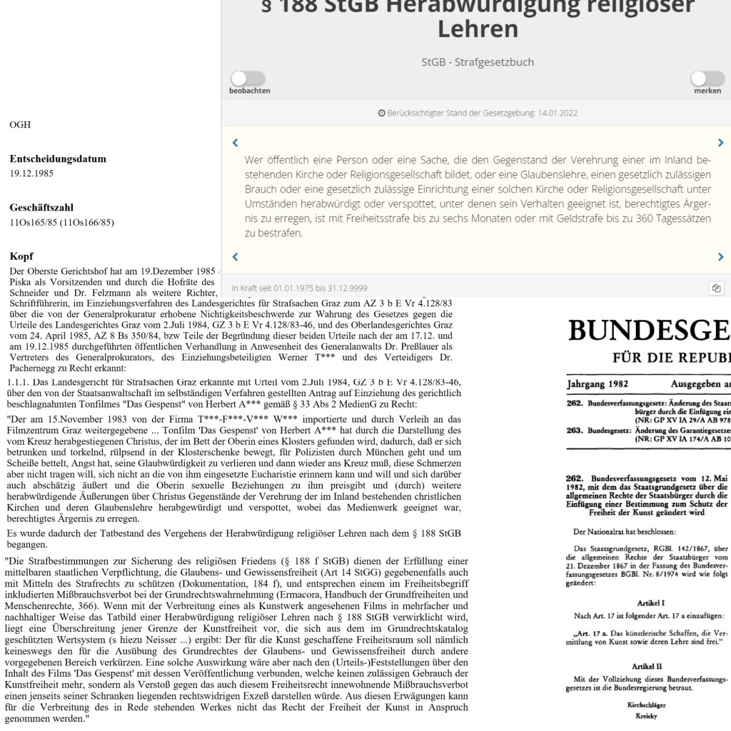 „Die Strafbestimmungen zur Sicherung des religiösen Friedens (§ 188 f StGB) dienen der Erfüllung einer mittelbaren staatlichen Verpflichtung, die Glaubens- und Gewissensfreiheit (Art 14 StGG) gegebenenfalls auch mit Mitteln des Strafrechts zu schützen (Dokumentation, 184 f), und entsprechen einem im Freiheitsbegriff inkludierten Mißbrauchsverbot bei der Grundrechtswahrnehmung (Ermacora, Handbuch der Grundfreiheiten und Menschenrechte, 366). Wenn mit der Verbreitung eines als Kunstwerk angesehenen Films in mehrfacher und nachhaltiger Weise das Tatbild einer Herabwürdigung religiöser Lehren nach § 188 StGB verwirklicht wird, liegt eine Überschreitung jener Grenze der Kunstfreiheit vor, die sich aus dem im Grundrechtskatalog geschützten Wertsystem (s hiezu Neisser …) ergibt: Der für die Kunst geschaffene Freiheitsraum soll nämlich keineswegs den für die Ausübung des Grundrechtes der Glaubens- und Gewissensfreiheit durch andere vorgegebenen Bereich verkürzen. Eine solche Auswirkung wäre aber nach den (Urteils‑)Feststellungen über den Inhalt des Films ‚Das Gespenst‘ mit dessen Veröffentlichung verbunden, welche keinen zulässigen Gebrauch der Kunstfreiheit mehr, sondern als Verstoß gegen das auch diesem Freiheitsrecht innewohnende Mißbrauchsverbot einen jenseits seiner Schranken liegenden rechtswidrigen Exzeß darstellen würde. Aus diesen Erwägungen kann für die Verbreitung des in Rede stehenden Werkes nicht das Recht der Freiheit der Kunst in Anspruch genommen werden.“