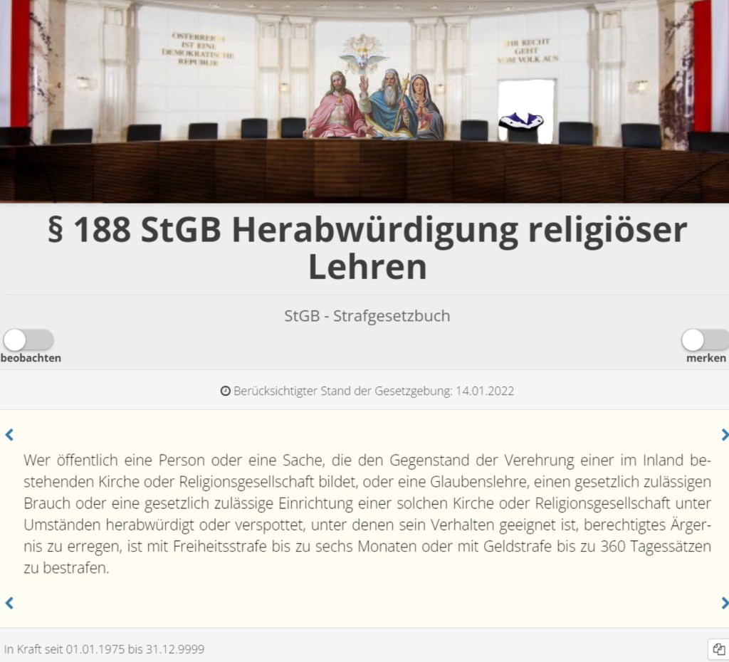 Nicht nur der Zahntechniker und seine Parteikameraderie halten sich an das österreichische Staatsgrundgesetz, nicht nur diesen ist die österreichische Verfaßtheit gesinnungsgemäße erste und einzige Richtschnur, sondern auch österreichischen Gerichten, die bereits nach etwa einem Jahr der staatsgrundgesetzlichen Festschreibung der Freiheit der Kunst den Film „Das Gespenst“ von Herbert Achternbusch die Freiheit zuerkannte, die ein solches Werk für sie in Österreich je nur haben kann – Einziehungsverfahren des Landesgerichtes für Strafsachen Graz zum AZ 3 b E Vr 4.128/83 … eine Freiheit, die am 19. Dezember ’85 der österreichische Oberste Gerichtshof eindrücklich bestätigt …