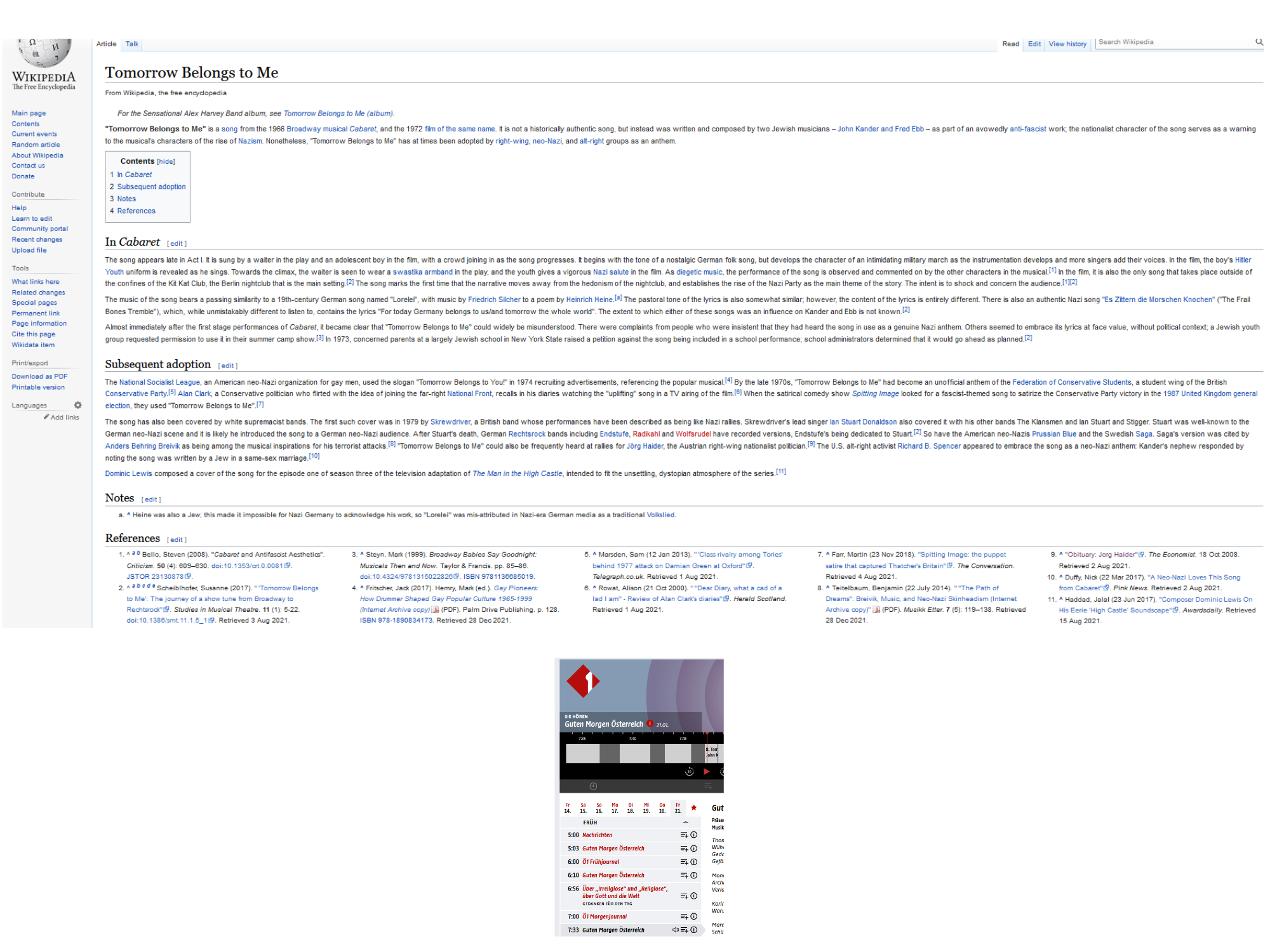 The music of the song bears a passing similarity to a 19th-century German song named „Lorelei“, with music by Friedrich Silcher to a poem by Heinrich Heine.[a] The pastoral tone of the lyrics is also somewhat similar; however, the content of the lyrics is entirely different. There is also an authentic Nazi song „Es Zittern die Morschen Knochen“ („The Frail Bones Tremble“), which, while unmistakably different to listen to, contains the lyrics „For today Germany belongs to us/and tomorrow the whole world“. The extent to which either of these songs was an influence on Kander and Ebb is not known.[2] Almost immediately after the first stage performances of Cabaret, it became clear that „Tomorrow Belongs to Me“ could widely be misunderstood. There were complaints from people who were insistent that they had heard the song in use as a genuine Nazi anthem. Others seemed to embrace its lyrics at face value, without political context; a Jewish youth group requested permission to use it in their summer camp show.[3] In 1973, concerned parents at a largely Jewish school in New York State raised a petition against the song being included in a school performance; school administrators determined that it would go ahead as planned.[2] Subsequent adoption The National Socialist League, an American neo-Nazi organization for gay men, used the slogan „Tomorrow Belongs to You!“ in 1974 recruiting advertisements, referencing the popular musical.[4] By the late 1970s, „Tomorrow Belongs to Me“ had become an unofficial anthem of the Federation of Conservative Students, a student wing of the British Conservative Party.[5] Alan Clark, a Conservative politician who flirted with the idea of joining the far-right National Front, recalls in his diaries watching the „uplifting“ song in a TV airing of the film.[6] When the satirical comedy show Spitting Image looked for a fascist-themed song to satirize the Conservative Party victory in the 1987 United Kingdom general election, they used „Tomorrow Belongs to Me“.[7] The song has also been covered by white supremacist bands. The first such cover was in 1979 by Skrewdriver, a British band whose performances have been described as being like Nazi rallies. Skrewdriver’s lead singer Ian Stuart Donaldson also covered it with his other bands The Klansmen and Ian Stuart and Stigger. Stuart was well-known to the German neo-Nazi scene and it is likely he introduced the song to a German neo-Nazi audience. After Stuart’s death, German Rechtsrock bands including Endstufe, Radikahl and Wolfsrudel have recorded versions, Endstufe’s being dedicated to Stuart.[2] So have the American neo-Nazis Prussian Blue and the Swedish Saga. Saga’s version was cited by Anders Behring Breivik as being among the musical inspirations for his terrorist attacks.[8] „Tomorrow Belongs to Me“ could also be frequently heard at rallies for Jörg Haider, the Austrian right-wing nationalist politician.[9] The U.S. alt-right activist Richard B. Spencer appeared to embrace the song as a neo-Nazi anthem: Kander’s nephew responded by noting the song was written by a Jew in a same-sex marriage.[10]