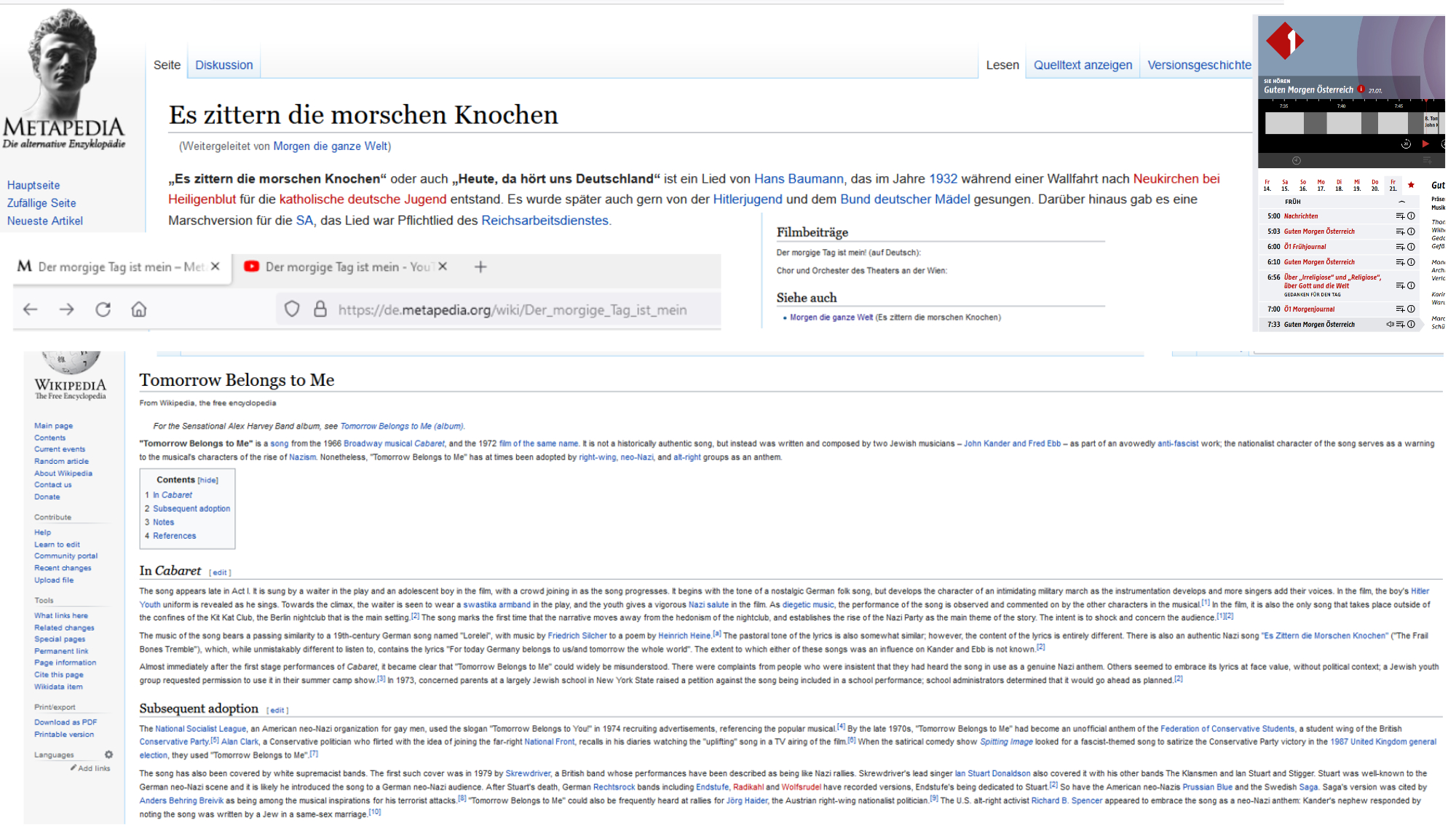 In der deutschsprachigen Wikipedia-Ausgabe gibt es nicht den Artikel „Tomorrow belongs to me“, der davon berichtet, von wem dieses Lied als Hymne angenommen wurde; das ist auch ohne Übersetzung zu verstehen.