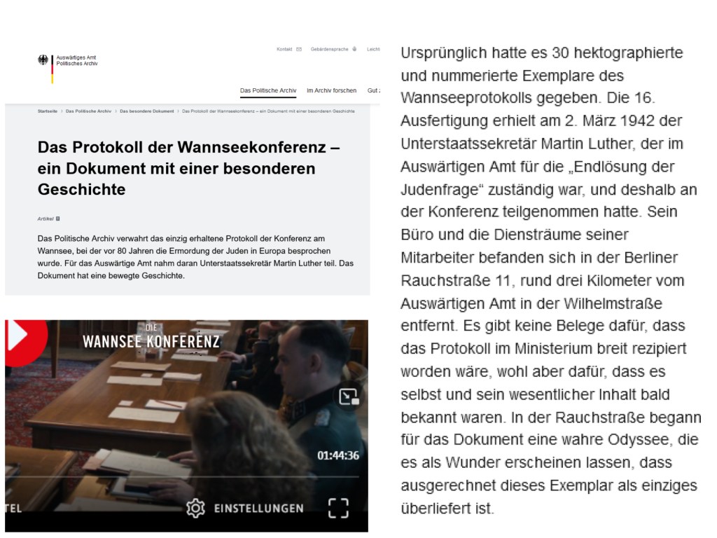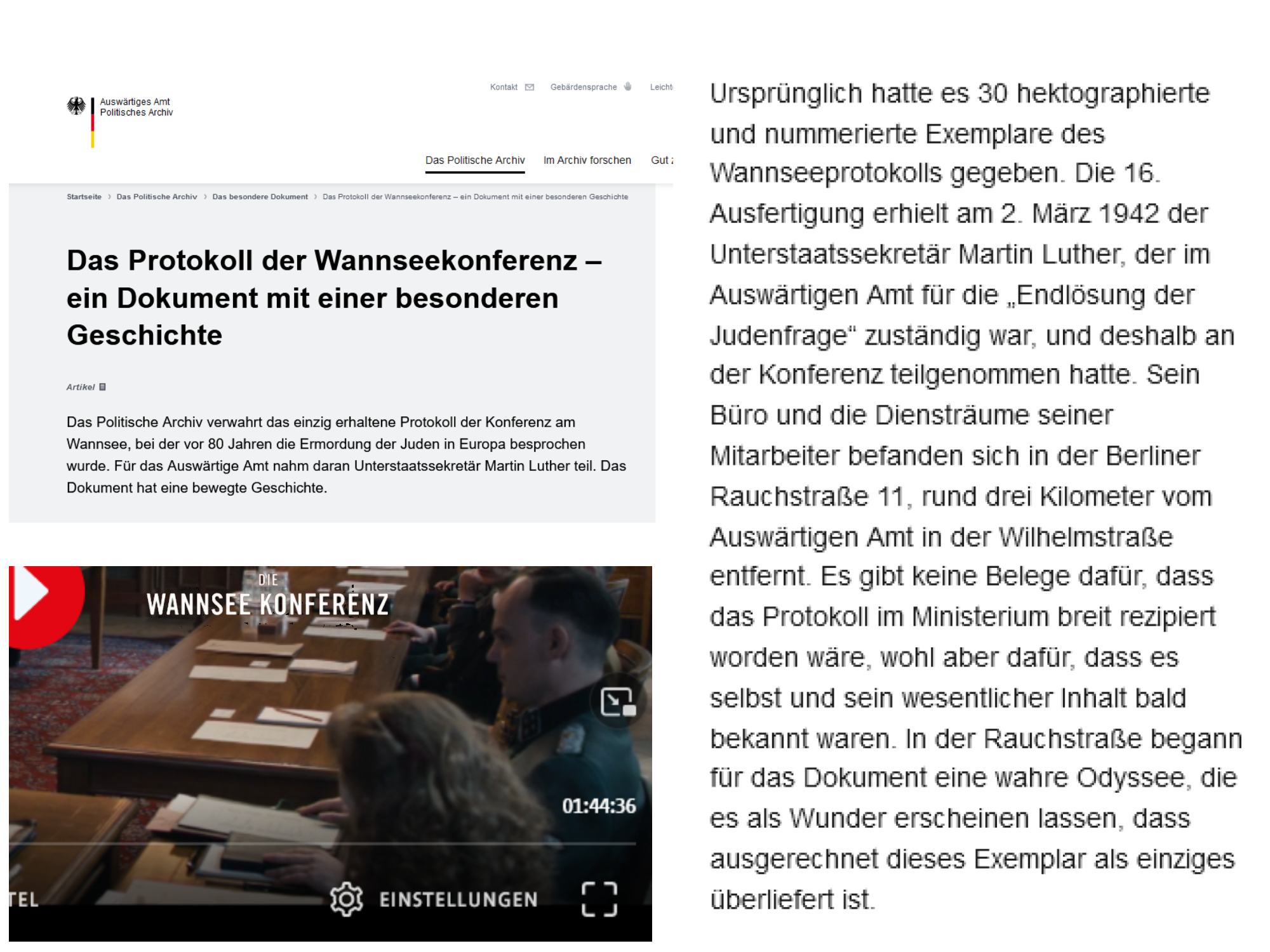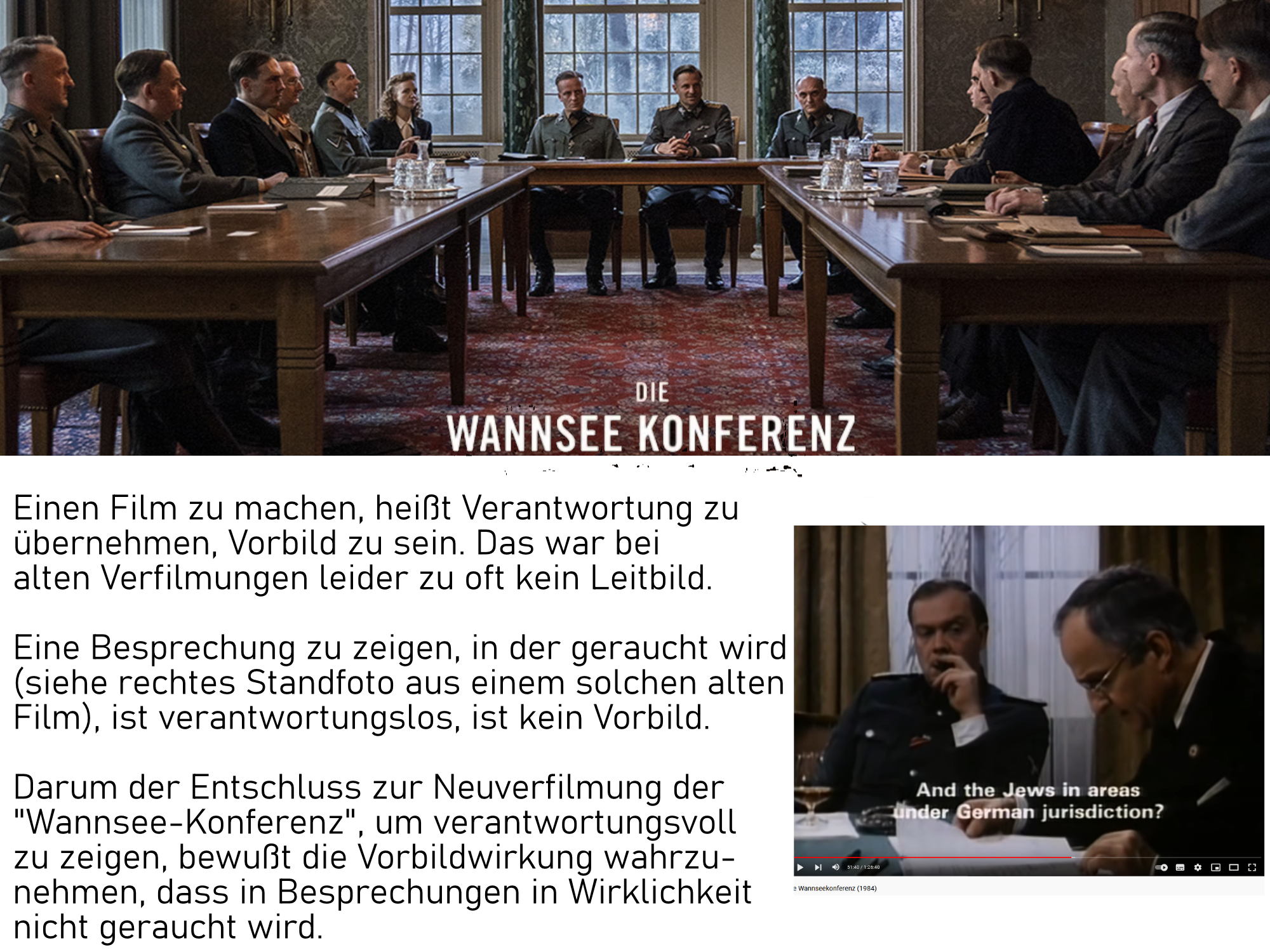 Später habe er, Adolf Eichmann, in Argentinien für Mercedes Benz gearbeitet und so endet der Korso der Automobile – mit schwarzen Limousinen zur Besprechung 1933, mit schwarzen Limousen zur Besprechung 1942 … Es wird wohl ein neuer Film über die „Besprechung mit anschließendem Frühstück um 12“ notwendig geworden sein, um dem Publikum zu ersparen, sich weiter Filme Film über eine Besprechung politisch inkorrekt ansehen zu müssen, in denen ungeniert geraucht wird …