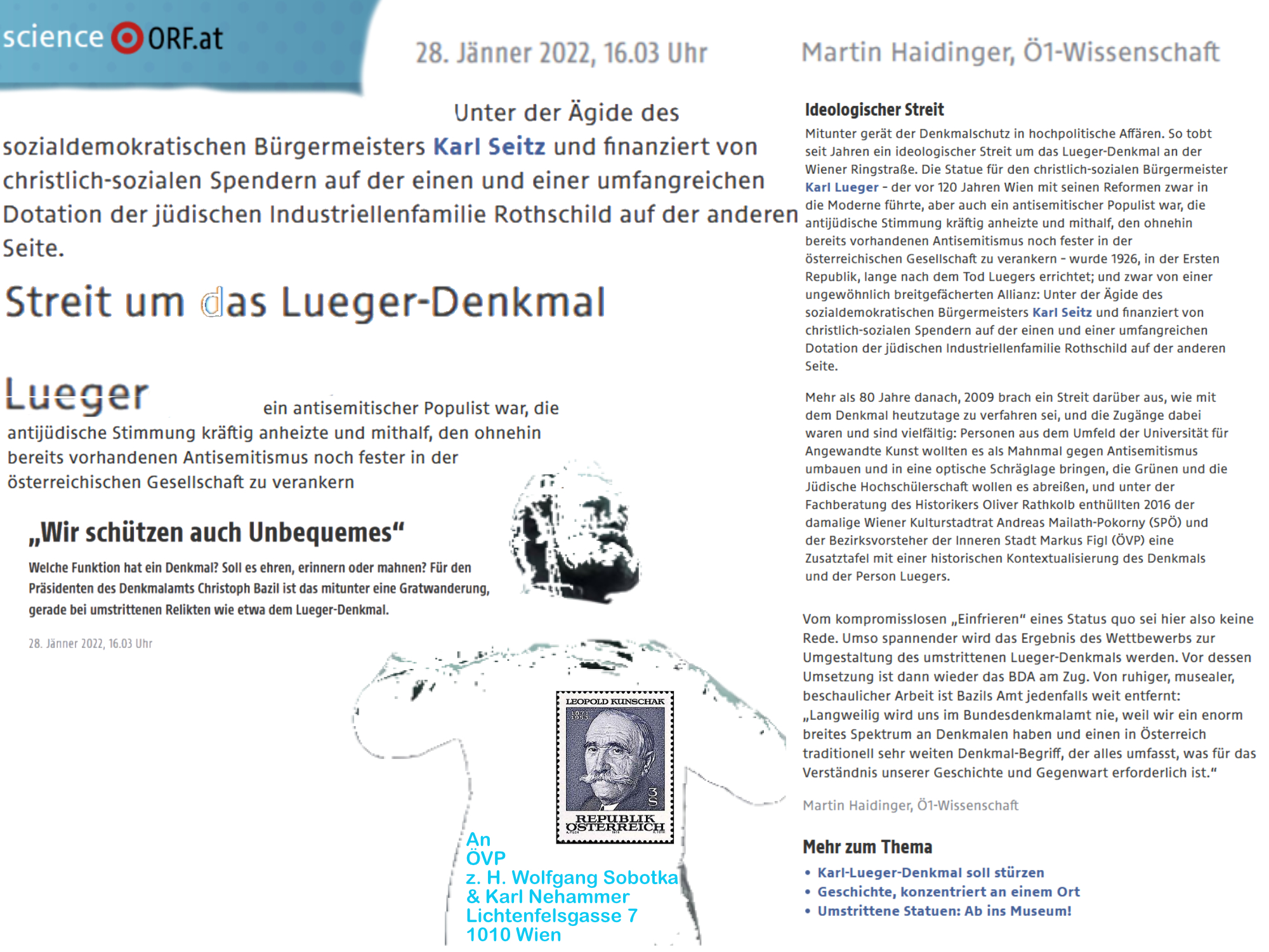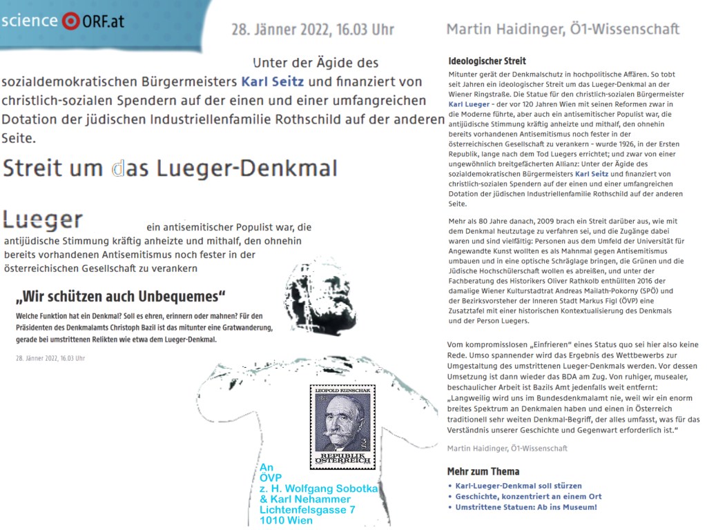 „Mitunter gerät der Denkmalschutz in hochpolitische Affären. So tobt seit Jahren ein ideologischer Streit um das Lueger-Denkmal an der Wiener Ringstraße. Die Statue für den christlich-sozialen Bürgermeister Karl Lueger – der vor 120 Jahren Wien mit seinen Reformen zwar in die Moderne führte, aber auch ein antisemitischer Populist war, die antijüdische Stimmung kräftig anheizte und mithalf, den ohnehin bereits vorhandenen Antisemitismus noch fester in derösterreichischen Gesellschaft zu verankern – wurde 1926, in der Ersten Republik, lange nach dem Tod Luegers errichtet; und zwar von einer ungewöhnlich breitgefächerten Allianz: Unter der Ägide des sozialdemokratischen Bürgermeisters Karl Seitz und finanziert von christlich-sozialen Spendern auf der einen und einer umfangreichen Dotation der jüdischen Industriellenfamilie Rothschild auf der anderen Seite.“