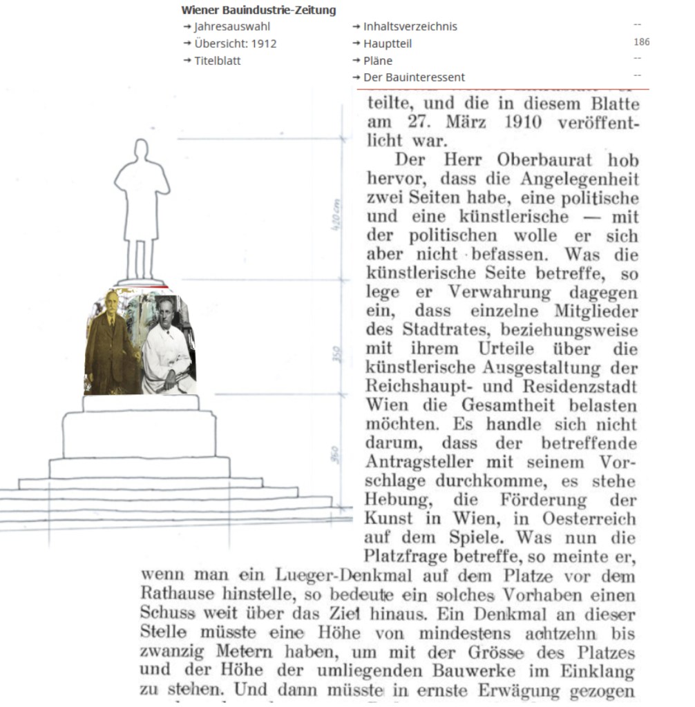 Was nun die Platzwahl betreffe, so meinte er, wenn man ein Lueger-Denkmal auf dem Platz vor dem Rathaus hinstelle, so bedeute ein solches Vorhaben einen Schuss weit über das Ziel hinaus. Ein Denkmal an dieser Stelle müsste eine Höhe von mindestens 18 bis 20 Metern haben, um mit der Größe des Platzes und der Höhe der umliegenden Bauwerke im Einklang zu stehen.