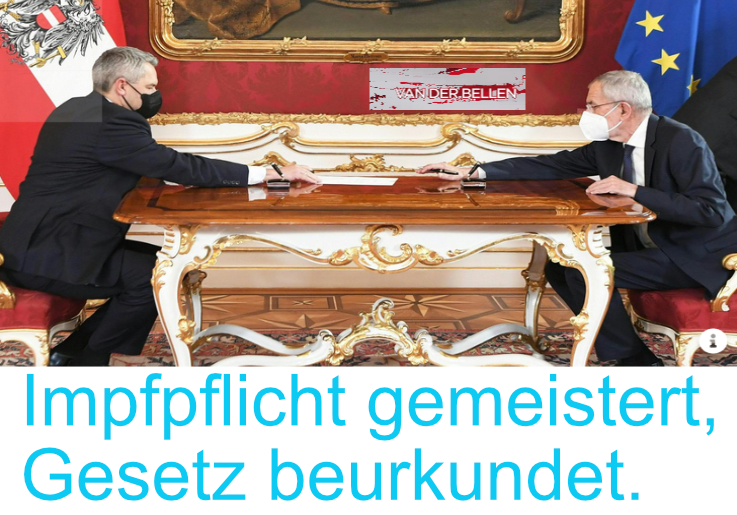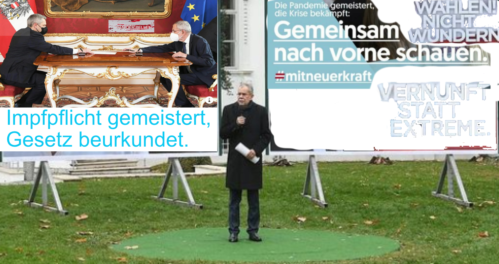 Am letzten Freitag, 4. Februar 2022, hat Alexander Van der Bellen die Impfpflicht beurkundet, damit ein Gesetz abgesegnet, gegen das es die größten Bedenken, die größten Vorbehalte mannigfacher Weise gibt, vor allem auch verfassungsrechtliche. Hätte er, Van der Bellen, der doch so in die Schönheit der Verfassung verliebt ist, dem die Verfassung Leitbild sein soll, dieses Bundesgesetz nicht zurückschicken müssen, allen die Arbeit ersparen müssen – vor allem dem Verfassungsgerichtshof, der ohnehin schon genug mit den Gesetzen dieser Regierung sich herumschlagen hat müssen –, mit einem verfassungsrechtlich hoch bedenklichen Gesetz weiter sich herumschlagen zu müssen …