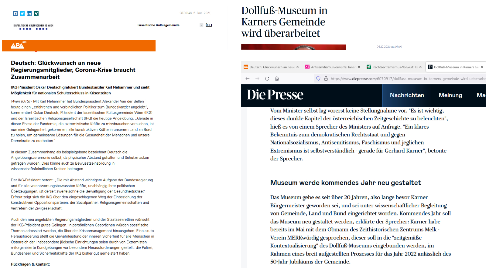 Der IKG-Präsident betont: „Die mit Abstand wichtigste Aufgabe der Bundesregierung und für alle verantwortungsbewussten Kräfte, unabhängig ihrer politischen Überzeugungen, ist derzeit zweifelsohne die Bewältigung der Gesundheitskrise.“ Erfreut zeigt sich die IKG über den eingeschlagenen Weg der Einbeziehung der konstruktiven Oppositionsparteien, der Sozialpartner, Religionsgemeinschaften und Vertretern der Zivilgesellschaft. Auch den neu angelobten Regierungsmitgliedern und der Staatssekretärin wünscht der IKG-Präsident gutes Gelingen. In persönlichen Gesprächen würden spezifische Themen adressiert werden, die über das Krisenmanagement hinausgehen. Eine akute Herausforderung stellt die Gewährleistung der inneren Sicherheit für alle Menschen in Österreich dar. Insbesondere jüdische Einrichtungen seien durch von Extremisten mitorganisierte Kundgebungen vor besondere Herausforderungen gestellt, die Polizei, Bundesheer und Sicherheitskräfte der IKG bisher gut gemeistert haben.