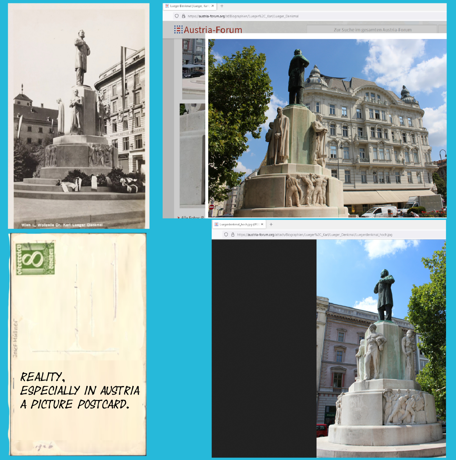 Wie leicht könnte einfach wie kurz gesagt werden, es wird die Propaganda des österreichischen Streichers – der in Österreich bekannt als Leopold Kunschak – fortgesetzt, ihn als einen die Häuser überragenden Bürgermeister müllnerisch darzustellen, wie er seit beinahe einhundert Jahren immer wieder auf propagandistischen Ansichtskarten verewigt: Karl Lueger, dessen Größe fotographisch in den Himmel gewachsen, als wäre sein Denkmal auf dem KL-Platz tatsächlich mehr als 20 Meter hoch, das in Wirklichkeit jedoch gerade die Hälfte davon klein …