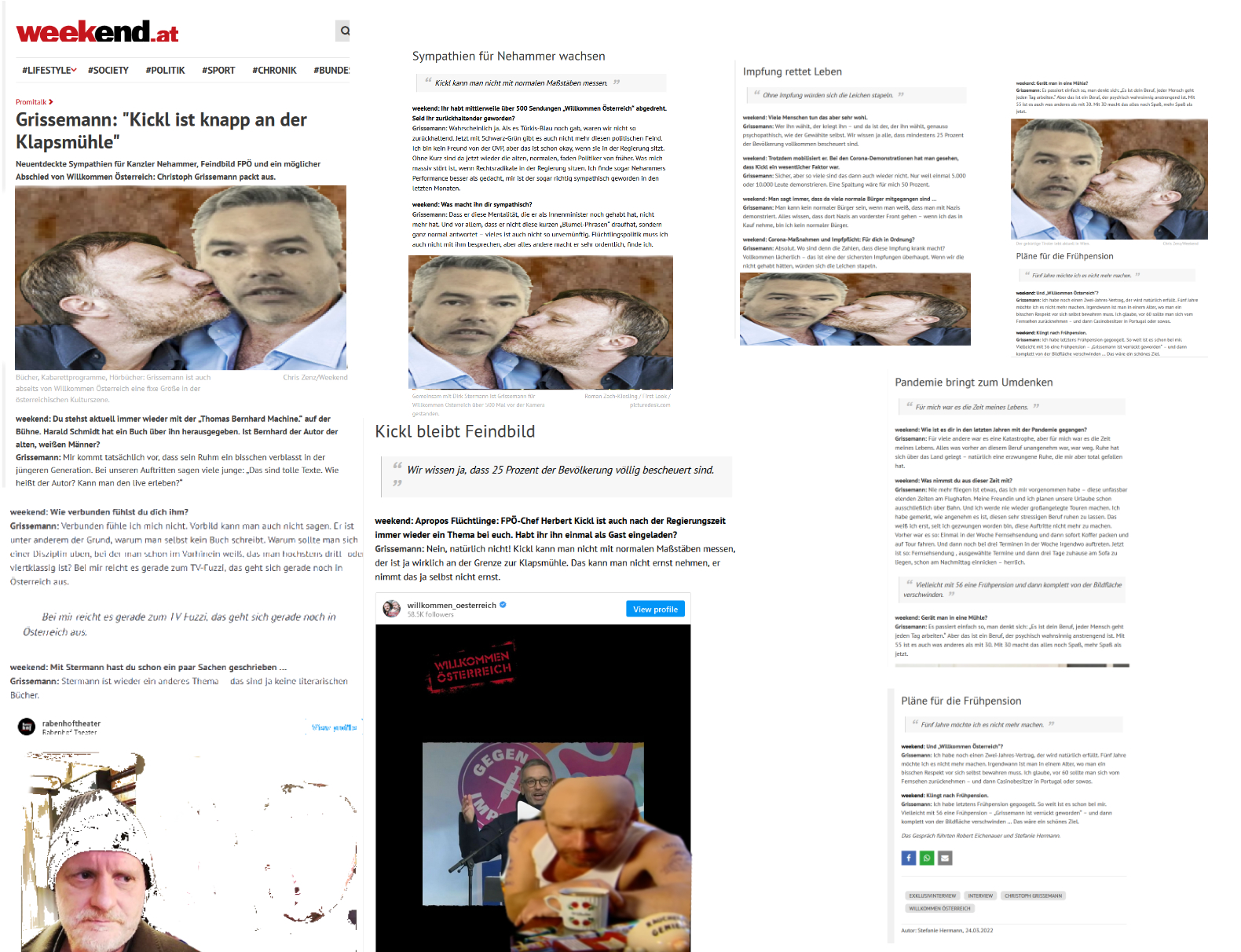 Es wäre das Interview mit Christoph Grissemann, von „Weekend.at“ am 24. März 2022 veröffentlicht, nicht zu erwähnen, wiese dieses nicht weit über ihn hinaus, erzählte dieses nicht exemplarisch stellvertretend für so viele, die dafür sorgen, daß das Rad der Mühle zur Speichelerzeugung niemals stillsteht.