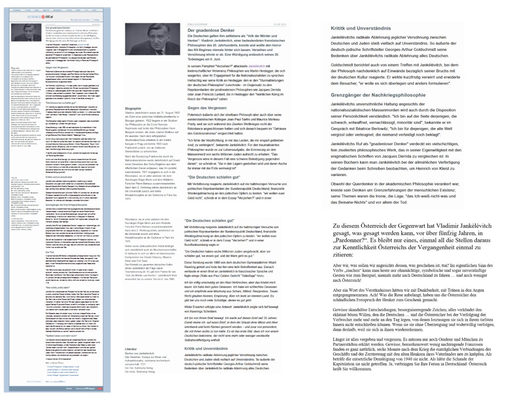 Nikolaus Halmer nutzt das öffentlich-rechtliche Medium oder der österreichische Rundfunk benutzt Nikolaus Halmer, Vladimir Jankélévitch durch seine Würdigung zu schmähen, die der österreichischen Tradition der Verleugnung, je etwas mit dem „Horror des NS-Regimes“ zu tun gehabt zu haben, treu ergeben ist.