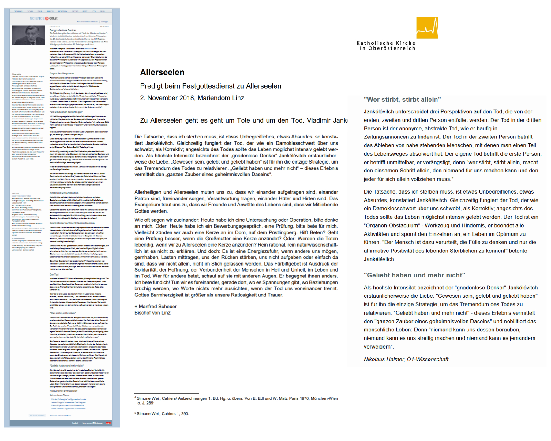 Wofür die rundfunklichen halmerischen Ausführungen tauglich sind, und das ist nicht erstaunlich: für eine Predigt in der Kirche. So predigt wortwörtlich Manfred Scheuer, Bischof, am 2. November 2018 im Mariendom Linz im Festgottesdienst zu Allerseelen. Der leitende Angestellte dieser Glaubensorganisation erwähnt Rundfunk und Halmer nicht, dankt ihnen in seiner Predigt nicht dafür, daß sie ihm einen so schönen Teil seiner Predigt verfaßten. Und in dieser Predigt spricht der leitende Angestellte auch von Simone Weil.