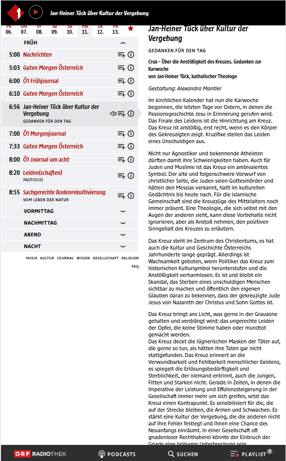 In der Passionszeit ’22 gibt Jan-Heiner Tück im österreichischen Rundfunk kurz vor sieben Uhr eine Definition des Organisierten Glaubens ab, die in ihrer Knappheit allumfassend den Charakter und das Wesen besonders des Organisierten Glaubens der römisch-katholischen Kirche end-gültig beschreibt.