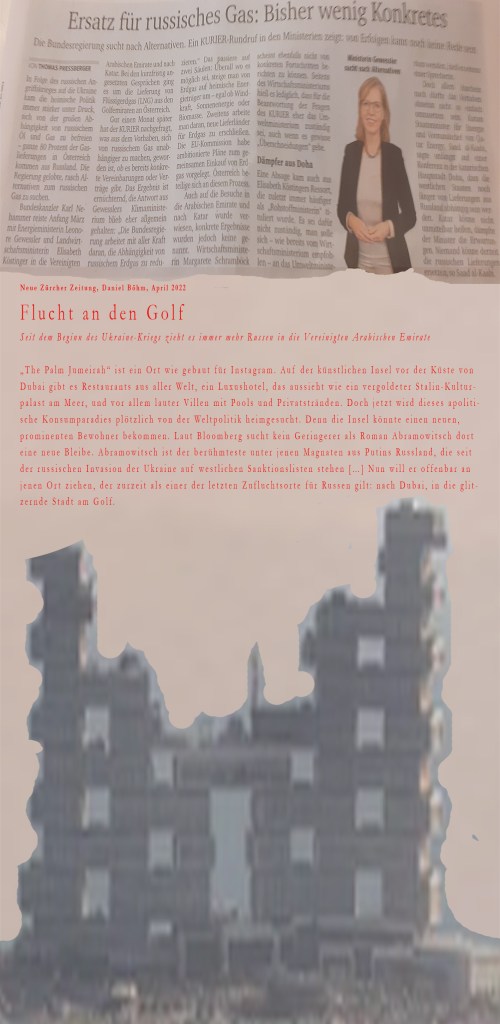 „The Palm Jumeirah“ ist ein Ort wie gebaut für Instagram. Auf der künstlichen Insel vor der Küste von Dubai gibt es Restaurants aus aller Welt, ein Luxushotel, das aussieht wie ein vergoldeter Stalin-Kulturpalast am Meer, und vor allem lauter Villen mit Pools und Privatstränden. Doch jetzt wird dieses apolitische Konsumparadies plötzlich von der Weltpolitik heimgesucht. Denn die Insel könnte einen neuen, prominenten Bewohner bekommen. Laut Bloomberg sucht kein Geringerer als Roman Abramowitsch dort eine neue Bleibe. Abramowitsch ist der berühmteste unter jenen Magnaten aus Putins Russland, die seit der russischen Invasion der Ukraine auf westlichen Sanktionslisten stehen […] Nun will er offenbar an jenen Ort ziehen, der zurzeit als einer der letzten Zufluchtsorte für Russen gilt: nach Dubai, in die glitzernde Stadt am Golf.