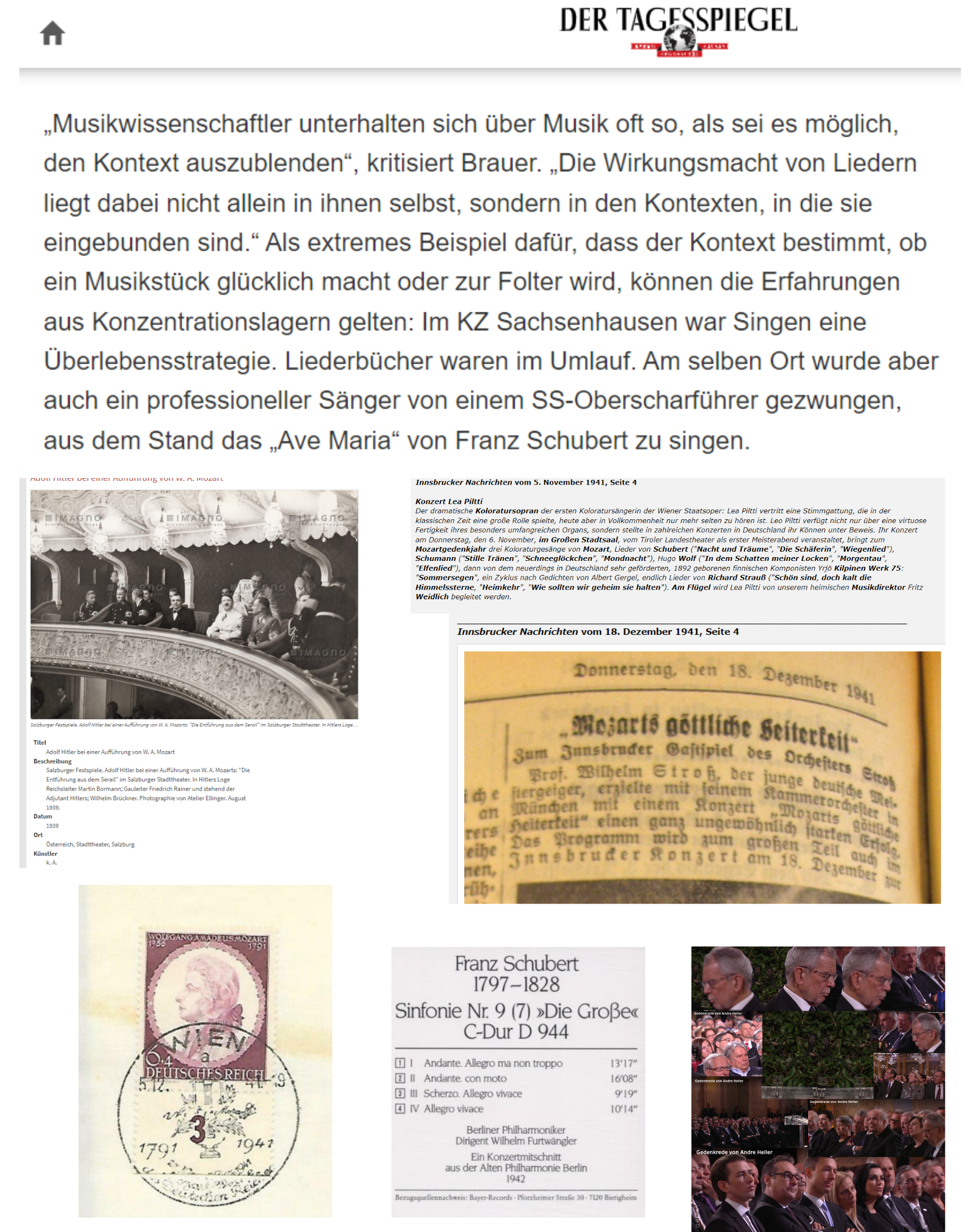 So muß auch etwa Adolf Hitler in der unverlierbaren Heimat seine Zuflucht gehabt haben, bei Mozart, überhaupt die nationalsozialistischen Menschen in der unverlierbaren Heimat ihre Zuflucht gefunden haben, bei Mozart, bei Schubert, überallhin, wohin sie im Auftrag der Vorsehung gerufen waren, Anständigkeit, die auch für den Vortragenden ein hohes Gut ist, zu bringen, dort überall ist ihnen Mozart, Schubert, aber auch die Lyrik, die Literatur insgesamt ewiglich Zuflucht im Groben und Lieblosen …