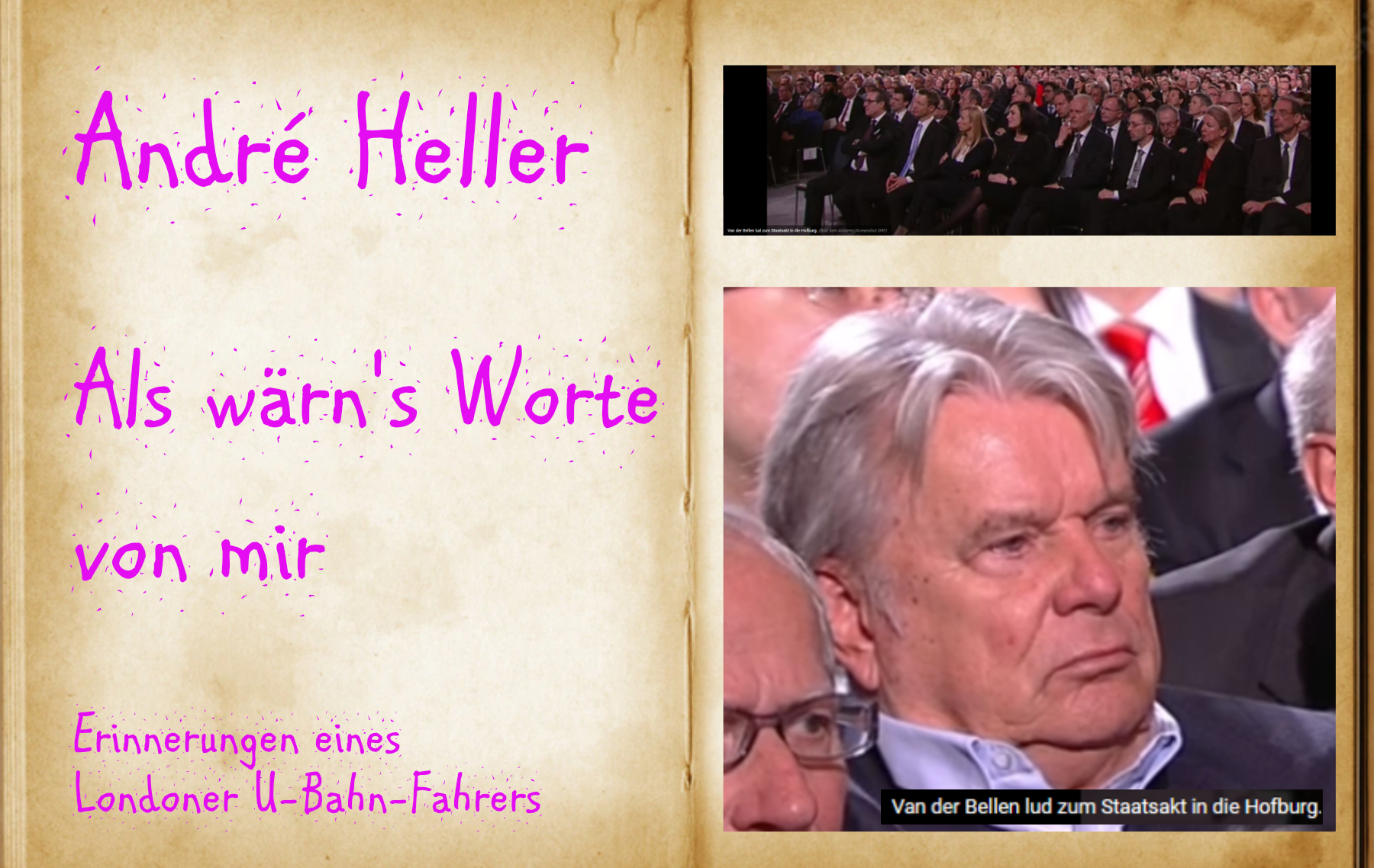 „Die Haushälterin öffnete und sah sich drei jüngeren Männern in Polizeiuniformen mit Hakenkreuzbinden […] Mit beachtlichem Mut antwortete das Fräulein Králíček: Bitte schön, die Herrschaften empfangen nur nach Voranmeldung. […] Dann stießen sie das Mädchen […] In diesem Augenblick erschien mein Vater […] hinter ihm angstvoll meine vierundzwanzigjährige Mama […] So zumindest erinnert es meine Mutter, die heute in ihrem 104. Lebensjahr zuhause die Übertragung dieser Veranstaltung im ORF […] Während der Wartezeit zwangen die drei Männer meine völlig eingeschüchterte Mutter […] Als mein Vater zurückkam, trug er über dem dreiteiligen Anzug einen Kamelhaarmantel, den er mit allen Orden, die ihm als Offizier im Ersten Weltkrieg verliehen wurden, dekoriert hat. Was soll die Frechheit? Schrie einer der Schergen [..] Und zwangen ihn [Stephan Heller] eine voll Stunde […] auf den Gehsteigen gemalte Schuschnigg-Parolen, Aufrufe zur Volksabstimmung für ein freies Österreich […]