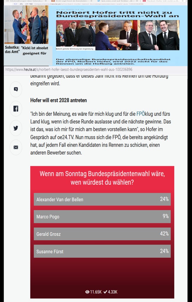 „Gerald Grosz 42 %, Susanne Fürst 24 %, Alexander Van der Bellen 24 %, Marco Pogo 9 %“ … Das ist das Ergebnis einer Umfrage einer österreichischen Umsonst-Zeitung, die Lesende zwar kostenlos konsumieren können, aber die doch nicht gratis ist, am 13. Mai 2022.