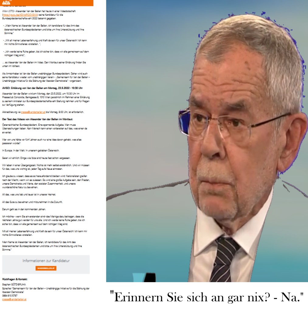 Their best man hat das in seiner Presseaussendung vom letzten Sonntag nicht geschrieben. Er schreibt: „„Mein Name ist Alexander Van der Bellen, ich kandidiere für das Amt des österreichischen Bundespräsidenten und bitte um […]“ Er spricht durchweg vom Bundespräsidenten als Mann.