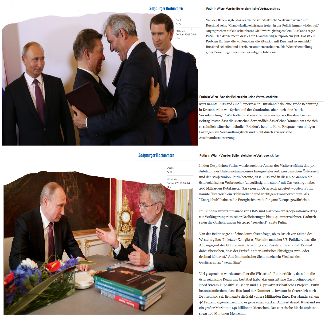 Van der Bellen sagte auf eine Journalistenfrage, ob es Druck von Seiten des Westens gäbe: „In letzter Zeit gibt es Vorhalte mancher US-Politiker, dass die Abhängigkeit der EU in dieser Beziehung von Russland zu groß ist. Es wird dabei übersehen, dass der Preis für amerikanisches Flüssiggas zwei- oder dreimal höher ist.“ Aus ökonomischer Sicht mache ein Wechsel des Gaslieferanten „wenig Sinn“.