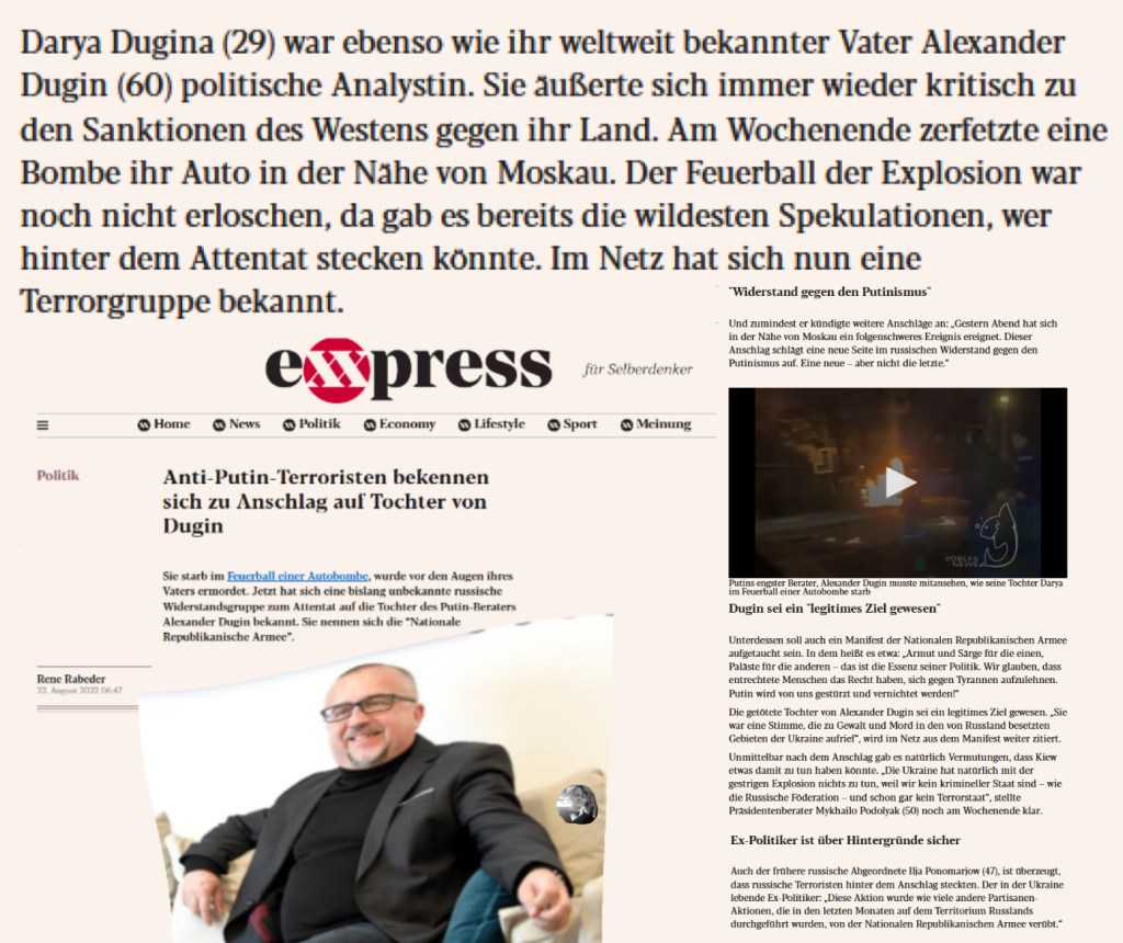 Darya Dugina (29) war ebenso wie ihr weltweit bekannter Vater Alexander Dugin (60) politische Analystin. Sie äußerte sich immer wieder kritisch zu den Sanktionen des Westens gegen ihr Land. Putins engster Berater, Alexander Dugin musste mitansehen, wie seine Tochter Darya im Feuerball einer Autobombe starb