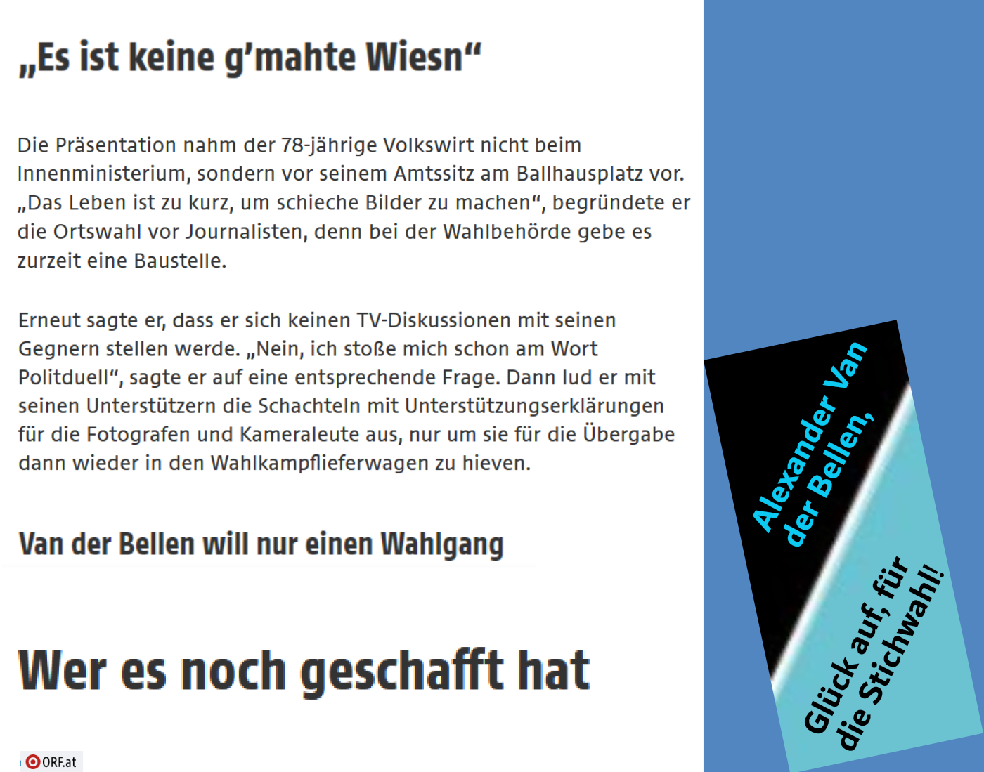 Es ist auch nicht notwendig, daß er noch einmal in TV-Diskussionen geht, um mit seinen Bewerbern – es werden, ach, gute alte, alte Zeit des 21. Jahrhunderts, diesmal ausschließlich Männer sein – sich auszutauschen, zu erzählen, zu beteuern, wie er, Alexander Van der Bellen, in den nächsten … die Wählenden brauchen für ihre Stimmentscheidung bloß die sechs Jahre seiner letzten Amtszeit in Erinnerung zu rufen, um zu wissen, was sie von ihm zu erwarten haben werden, er braucht nichts mehr zu versprechen, sie werden sich je nicht zu wundern brauchen, was alles nicht geht —