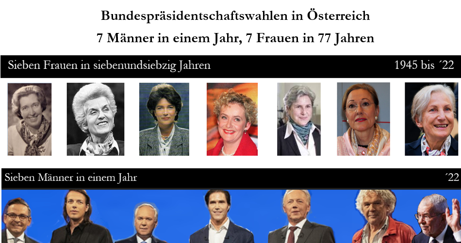 Sieben Männer in einem Jahr, die nicht als Gruppe der glorreichen Sieben aufreiten, von denen aber ein jeder für sich meint, ein Glorreicher zu sein, bewerben sich um das Amt der Bundespräsidentin, während in siebenundsiebzig Jahren es insgesamt nur sieben Frauen ermöglicht wurde, sich um das Amt der Bundespräsidentin zu bewerben, und alle sieben Frauen erfolglos aus den Wahlen hervorgingen – des Herrn in Mehrzahl Erfolg …