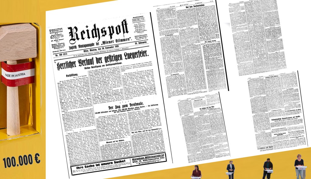 Und dann geht es durch dreieinhalb Stunden weiter: Gruppe um Gruppe defiliert vor den Festgästen, Hunderte Fahnen, viele mit dem Luegerbild geschmückt, neigen sich grüßend vor dem erzenen Bild des unvergeßlichen Bürgermeisters. Ununterbrochen branden Rufe der Begeistsrung zu ihm empor. „Hoch Lueger!“ „Hoch der V o l k s b ü r g er m e i s t e r!“ ,,Hoch das christliche Wien!“ hallt es ohne Unterlaß. In diese Rufe mengen sich Kundgebungen für den Obmann des Luegerdenkmalkomitees Nationalrat Kunschak. „Hoch Lueger!“, „Hoch Kunschak!“, diese Rufe vereinen sich immer wieder, auch im gemütlichsten Wiener Dialekt Dann lauten sie ungefähr so: „Steig aber, Karl!“, „Servus Poldl!“ Auch den übrigen Festgästen, insbesondere Altbundeskanzler Dr. Seipel und Kardinal Erzbischof Dr. Pissl, jubeln die vorbeimarschierenden Gruppen zu. Immer wieder stimmen die Musikkapellen den Luegermarsch und das „O, du mein Oesterreich“ an, die sich fast symbolisch ergänzen. Einige Augenblicksbilder von der Defilierung: Die Pfadfinder ziehen mit zum Treueschwur erhobenen Fingern an dem Denkmal vorbei, die Turnerinnen grüßen es mit einem „Gut Heil!“ im Sprechchor. Stürmisch ist die Begeisterung der Frauen. Sie winken dem Denkmal zu, jauchzen und jubilieren und wollen gar nicht mehr weiterziehen. Die Ordner müssen sie fast mit Gewalt antreiben. Rührend der Aufmarsch der alten Garde, der Bürgervereinigung. Die graubärtigen Herren waren das treueste Gefolge des Mannes, dessen Erzbild sie nun huldigen. Es ist keine Schande, wenn da unwillkürlich die Erinnerung an verflossene glanzvolle Tage lebendig wird und sich in die Silberfäden des einen oder anderen Bartes eine Tränenperle hängt. Aus der Gruppe der Trachtenvereine treten zwölf Linzerinnen mit ihren glitzernden Goldhauben […]