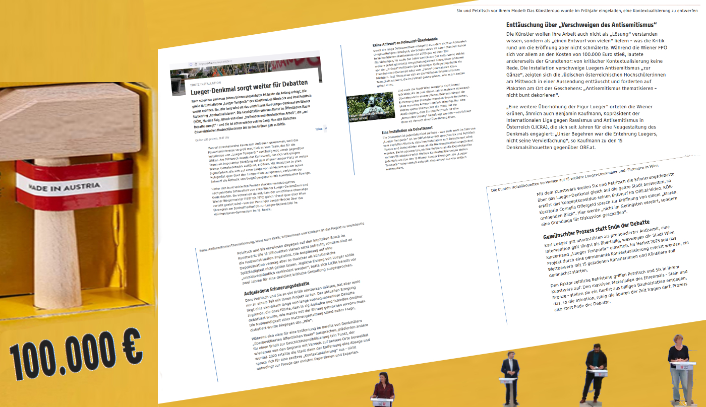 Festlich die Eröffnung der Skulptur von Nicole Six und Paul Petritsch – über diese kann noch nicht aus seitenlangen Berichten erzählt werden, nur das kann schon gesagt werden, sie sind nicht auch noch der Mähr aufgesessen, das Denkmal des Leopold Kunschak sei „weit über zwanzig Meter“ hoch, und so haben sie ihre Skulptur nur so weit in die Höhe gesteckt, geschraubt, gezimmert, geleimt … nach dem tatsächlichen Maß der Skulptur des Leopold Kunschak eben; ein Verdienst, das sie sich hoch anrechnen —