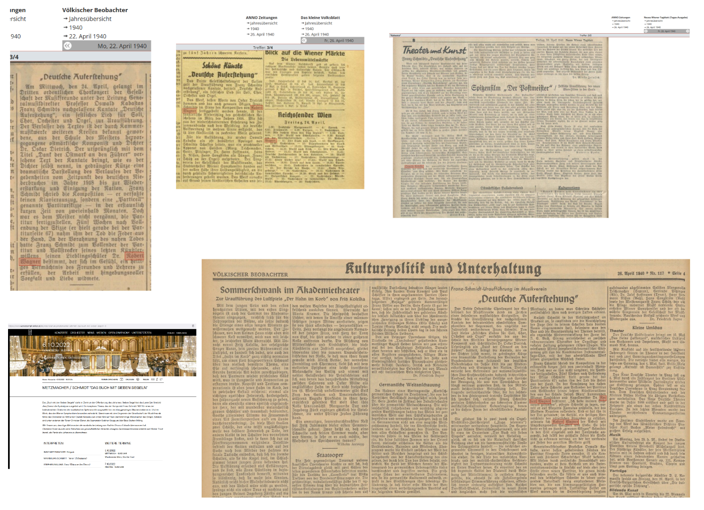 Im Musikverein unter Leitung Oswald Kabastas Franz Schmidts nachgelassenes Werk „Deutsche Auferstehung“ zur Uraufführung. Dr. Robert Wagner, ein Schüler des verstorbenen Komponisten, hat das Werk, dem er im folgenden Worte der Beqeisterung zur Einführung widmet, nach Vorlagen des Meisters vollendet.