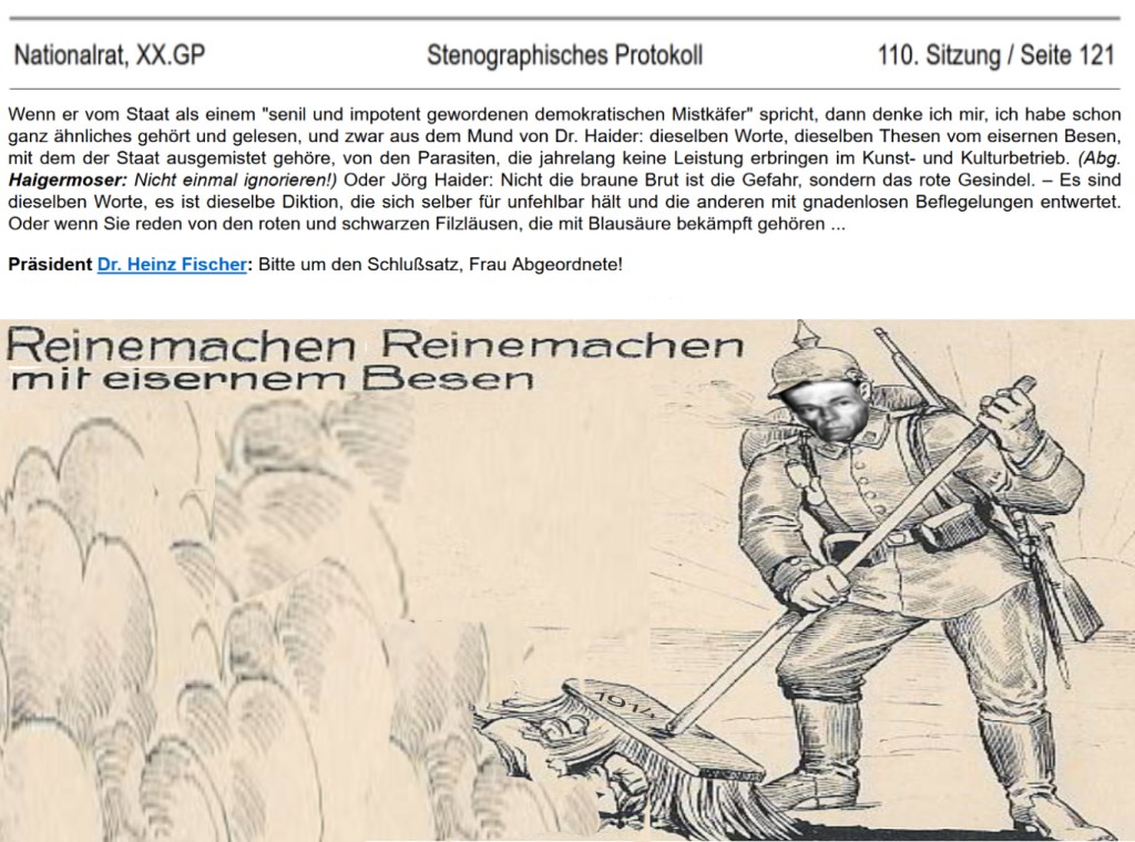 Immerwährende Gegenwart des Besens. Ewige Wiederkehr des eisernen Besens, der auch eine Mistgabel sein kann —