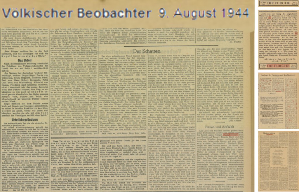 Im August 1944, der, es gab noch keinen Furchenwunderkalender, tatsächlich im nach für alle geltenden Furchenkalender der achte Monate war, schreibt Johanna Meinl im „Völkischen Beobachter“ über „Frauen und ihre Welt“, am 9. August 1944: