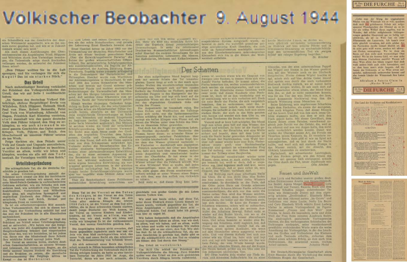 Im August 1944, der, es gab noch keinen Furchenwunderkalender, tatsächlich im nach für alle geltenden Furchenkalender der achte Monate war, schreibt Johanna Meinl im „Völkischen Beobachter“ über „Frauen und ihre Welt“, am 9. August 1944: