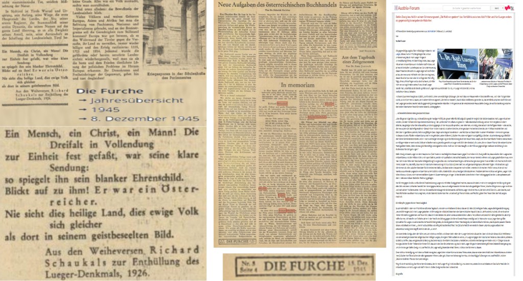 Am 8. Dezember 1945, knapp elf Monate nach der Befreiung von Auschwitz, die am 27. Jänner 1945 war – und „Die Furche“ will noch im November 2022, daß von ihr die Musik-der-Befreiung-Betrachtungslyrik von Roland Tenschert am „25. Januar 1945“ veröffentlicht wurde, ausgerechnet von Tenschert – läßt der Geläuter dies „aus den Weiheversen Richard Schaukals zur Enthüllung des Lueger-Denkmals, 1926“ von seinem Wochenblatt verbreiten —