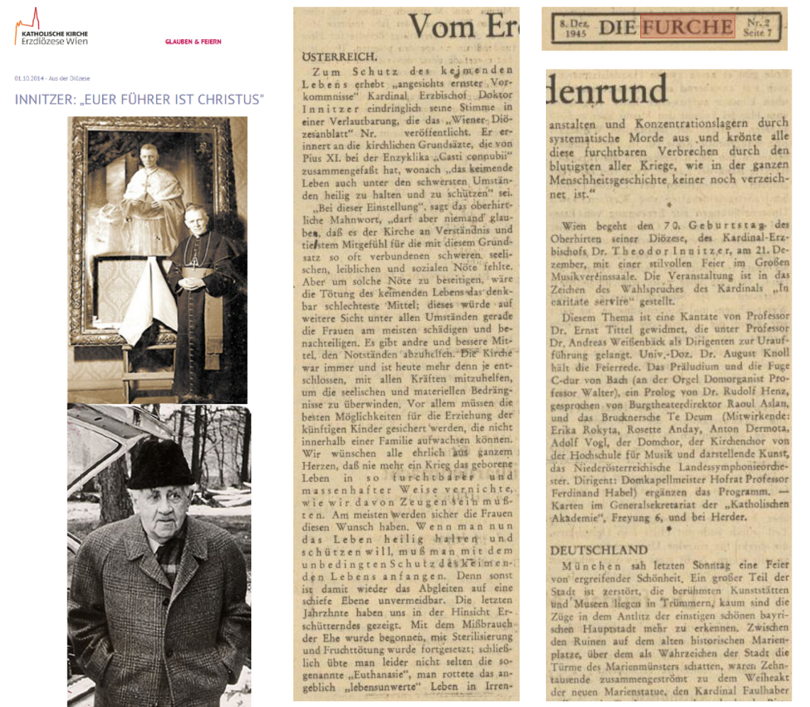 Zum Schutz des keimenden Lebens erhebt „angesichts ernster Vorkommnisse“ Kardinal Erzbischof Doktor Innitzer eindringlich seine Stimme. In einer Verlautbarung, die das: „Wiener Diözesanblatt“ Nr. veröffentlicht. Er erinnert an die kirchlichen Grundsätze, die von Pius XI. bei der Enzyklika „Casti connubii“ zusammengefaßt hat, wonach „das keimende Leben auch unter den schwersten Umständen heilig zu halten und zu schützen“ sei. „Bei dieser Einstellung“, sagt das oberhirtliche Mahnwort, „darf aber niemand glauben, daß es der Kirche an Verständnis und tiefstem Mitgefühl für die mit diesem Grundsatz so oft verbundenen schweren seelischen, leiblichen und sozialen Nöte fehlte. Aber um solche Nöte zu beseitigen, wäre die Tötung des keimenden Lebens das denkbar schlechteste Mittel; dieses würde auf weitere Sicht unter allen Umständen gerade die Frauen am meisten schädigen und benachteiligen. Es gibt andre und bessere Mittel, den Notständen abzuhelfen. Die Kirche war immer und ist heute mehr denn je entschlossen, mit allen Kräften mitzuhelfen, um die seelischen und materiellen Bedrängnisse zu überwinden, vor allem müssen die besten Möglichkeiten für die Erziehung der künftigen Kinder gesichert werden, die nicht innerhalb einer Familie aufwachsen können. Wir wünschen alle ehrlich aus ganzem Herzen, daß nie mehr ein Krieg das geborene Leben in so furchtbarer massenhafter Weise vernichte, wie wir davon Zeugen sein mußten. Am meisten werden sicher die Frauen diesen Wunsch haben. Wenn man nun das Leben heilig halten und schützen will, muß man mit dem des Lebens anfangen. Denn sonst ist damit wieder das Abgleiten auf eine schiefe Ebene unvermeidbar. Die letzten Jahrzehnte haben uns in der Hinsicht Erschütterndes gezeigt. Mit dem Mißbrauch der Ehe wurde begonnen, mit Sterilisierung und Fruchttötung wurde fortgesetzt; schließlich übte man leider nicht selten die sogenannte „Euthanasie“, man rottete das ‚angeblich „lebensunwerte“ Leben in Irrenanstalten und Konzentrationslagern durch systematische Morde aus‚ und krönte alle diese furchtbaren Verbrechen durch den blutigsten aller Kriege, wie in der ganzen Menschheitsgeschichte keiner noch verzeichnet, ist.