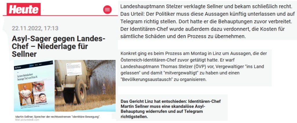 Der Politiker muss diese Aussagen künftig unterlassen und auf Telegram richtig stellen. Dort hatte er die Behauptungen zuvor verbreitet. Der Identitären-Chef wurde außerdem dazu verdonnert, die Kosten für sämtliche Schäden und den Prozess zu übernehmen.
