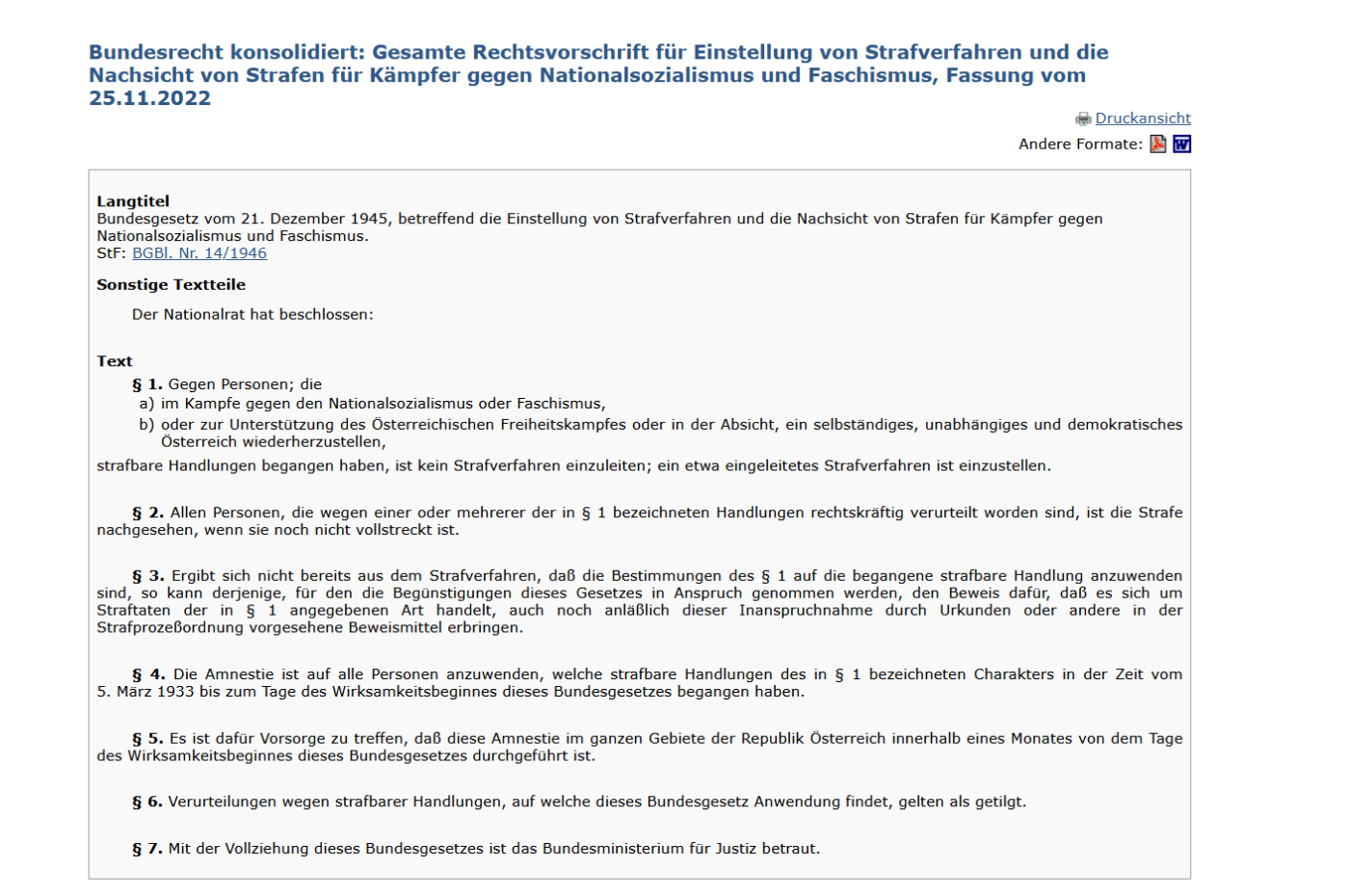 „Bundesgesetz vom 21. Dezember 1945, betreffend die Einstellung von Strafverfahren und die Nachsicht von Strafen für Kämpfer gegen Nationalsozialismus und Faschismus“