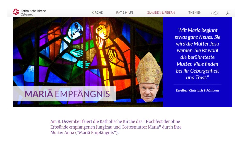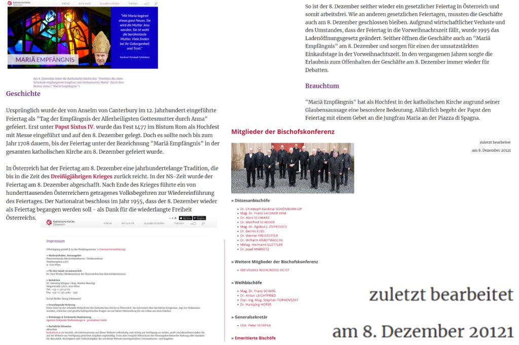 Das ist auf der offiziellen Website der katholischen Kirche in Österreich, deren Herausgeber und Medieninhaber die im reinen Männerbunde organisierten Bischöfe sind, zu lesen, am 3. Dezember 2022, geschrieben respektive „zuletzt bearbeitet am 8. Dezember 20121“ …