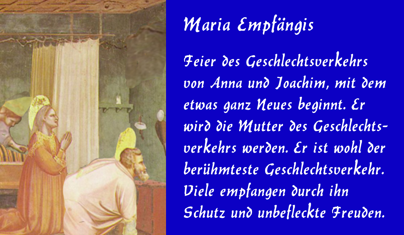 Wie kurz ist es im Vergleich zu dem, was in 18.099 Jahren zuletzt bearbeitet gewesen sein wird, erst her, daß es dieses Feiern des Geschlechtsverkehrs von Anna und Joachim als Feiertag in Österreich gibt, gerade einmal 375 Jahre. Und trotz dieser jubiläumslockenden Zahl kein Anlaß für ein Jubiläum, fehlen für Jubiläumsfeierlichkeiten des Geschlechtsverkehrs doch die paar madigen österreichischen NS-Jahre, in denen das hochamtliche Zelebrieren des ungeschützten Geschlechtsverkehrs ausgesetzt …