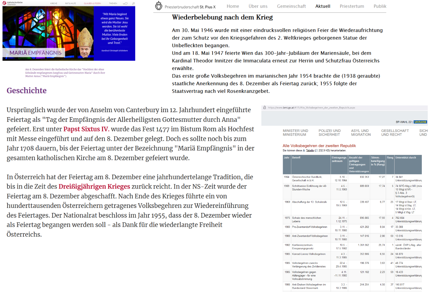 In Österreich [i]n der NS-Zeit wurde der Feiertag am 8. Dezember abgeschafft. Nach Ende des Krieges führte ein von hunderttausenden Österreichern getragenes Volksbegehren zur Wiedereinführung des Feiertages.