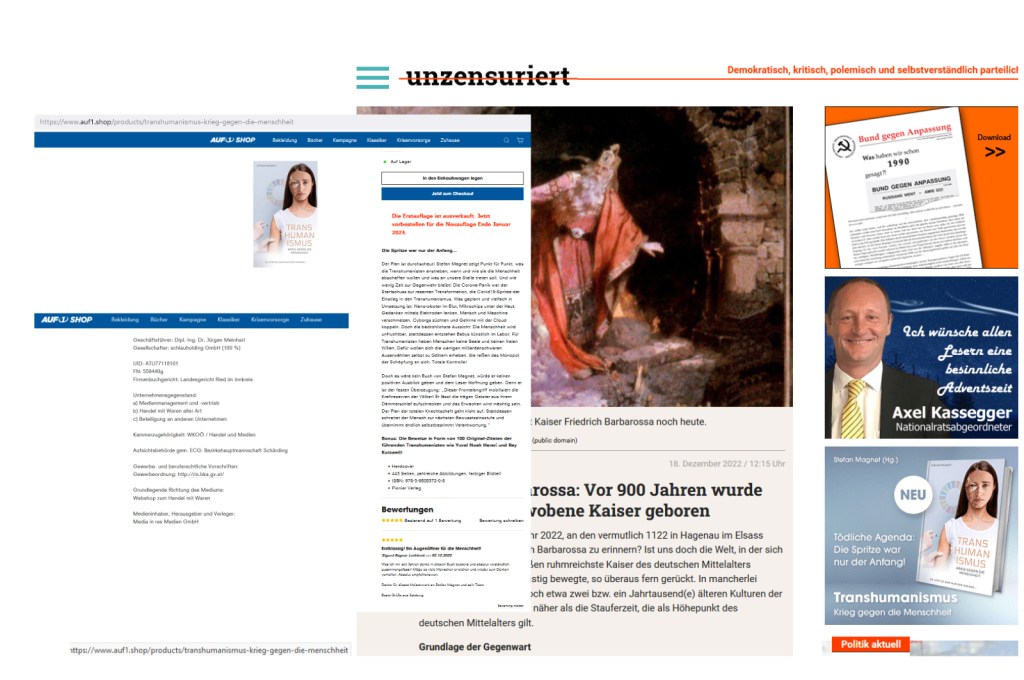 Dann gibt es, wie gesehen werden kann, eine ausgewiesene Werbung. Wodurch sofort gewußt wird, ja, es will etwas verkauft werden. Der Auf 1 Shop will verkaufen, auch Bücher, wie dieses: „Transhumanismus – Krieg gegen die Menschheit – Die Spritze war nur der Anfang“ …