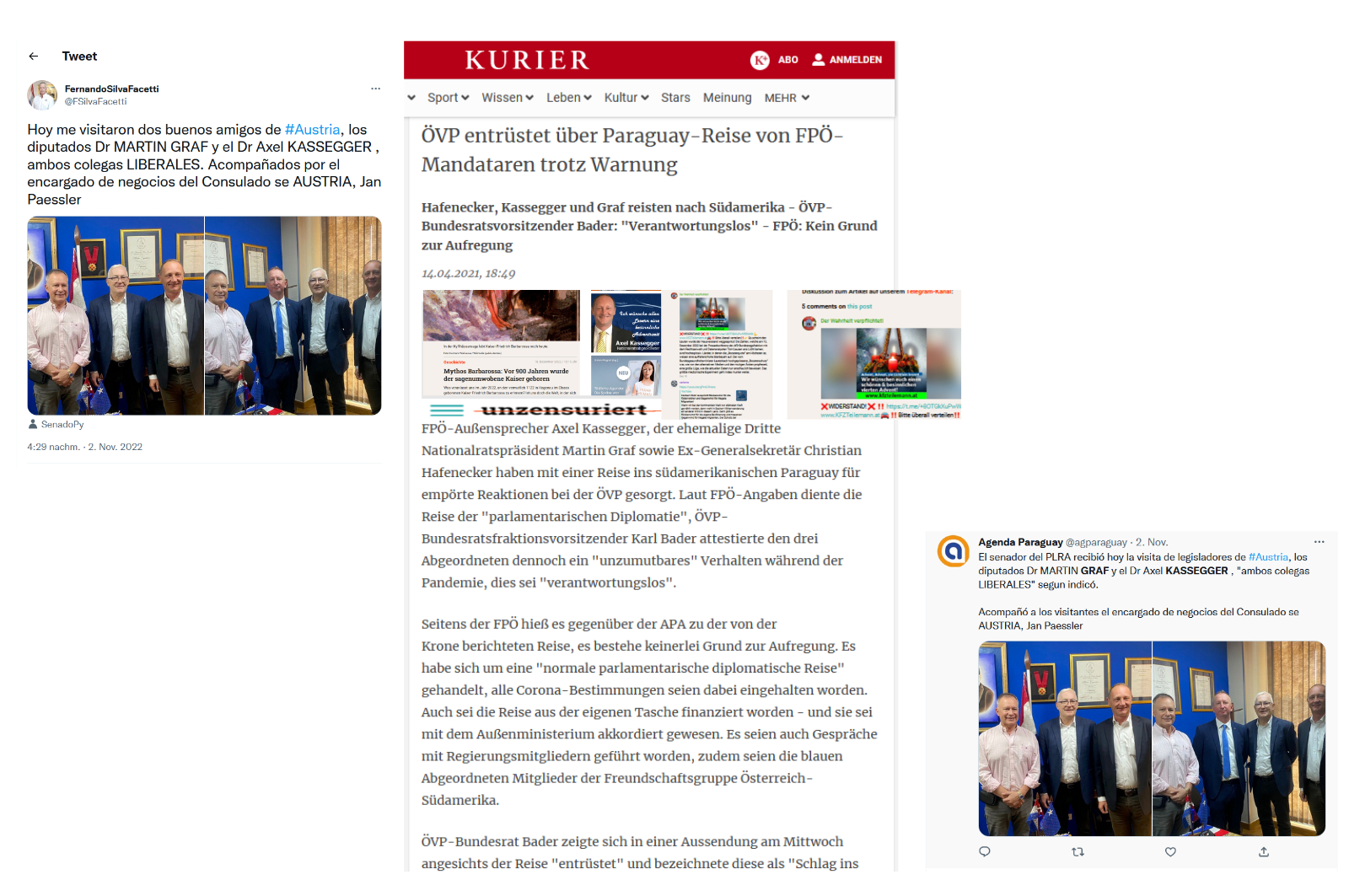 bestätigt wurde. Und nur wer liberal ist, ist ein Freund, so wie eben Axel Kassegger – ein Amigo, der sich international bewährt hat, der das internationale Parkett in Paraguay recht bestens kennt, seine Verbindungen im November 2022 wohl vertiefen konnte, die er vielleicht anläßlich seines Aufenthalts in Paraguay im letzten Jahr, also in 2021, bereits knüpfen konnte, als auch Christian Hafenecker mit dabei war – er scheint es nicht geschafft zu haben, zum „colegas liberales“ …