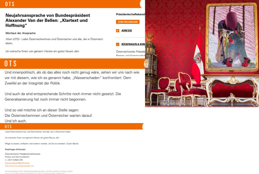 Er spricht menschgemäß von Hoffnung an diesem ersten Sonntag des Jahres 2023. Alle, die in Österreich leben, aber nach seiner Definition, keine Österreicherinnen, keine Österreicher und auch er nicht sind, gehen einem guten neuen Jahr entgegen; sie brauchen auf nichts zu warten, es wird ihnen schon am ersten Sonntag des neuen Jahres vom höchsten Staatsstuhl aus gelächelt bescheinigt, von ihnen allen, die in Österreich leben, wird nicht erwartet, daß sie warten, gar darauf, wie die Österreicherinnen und Österreicher, und er auch …. die Generalsanierung —