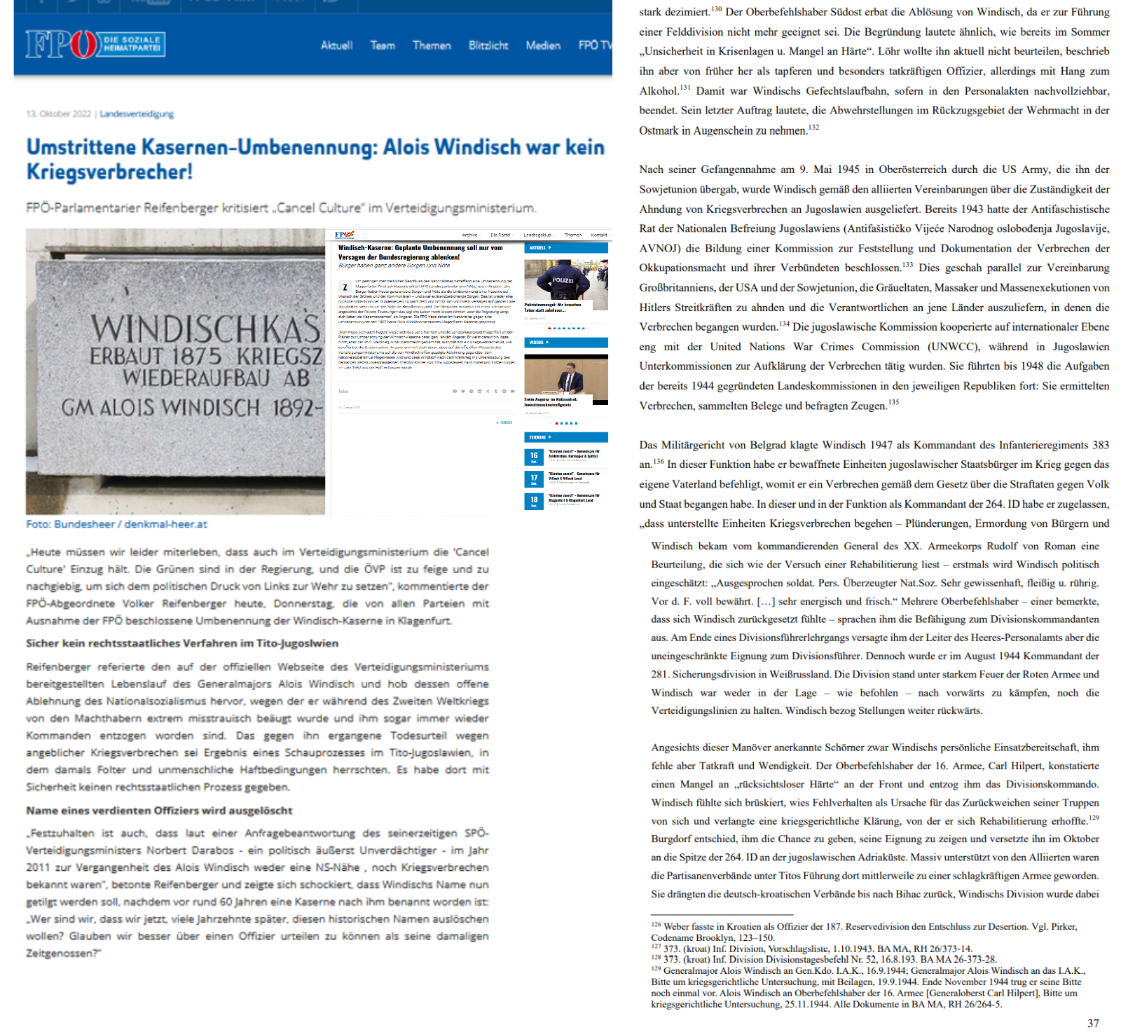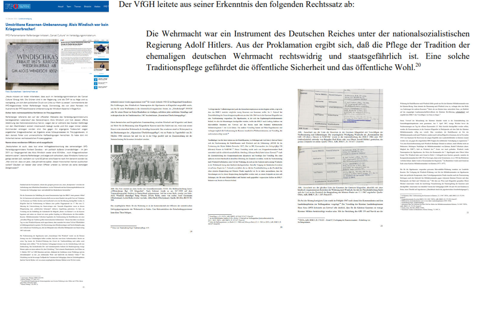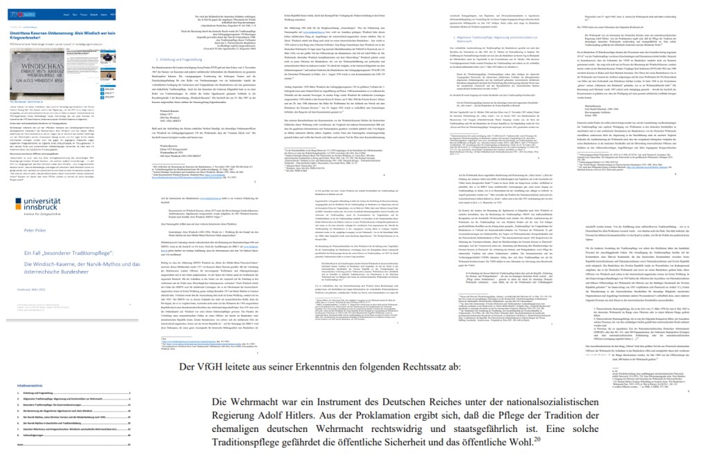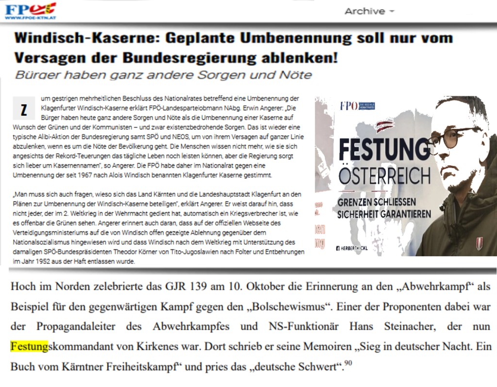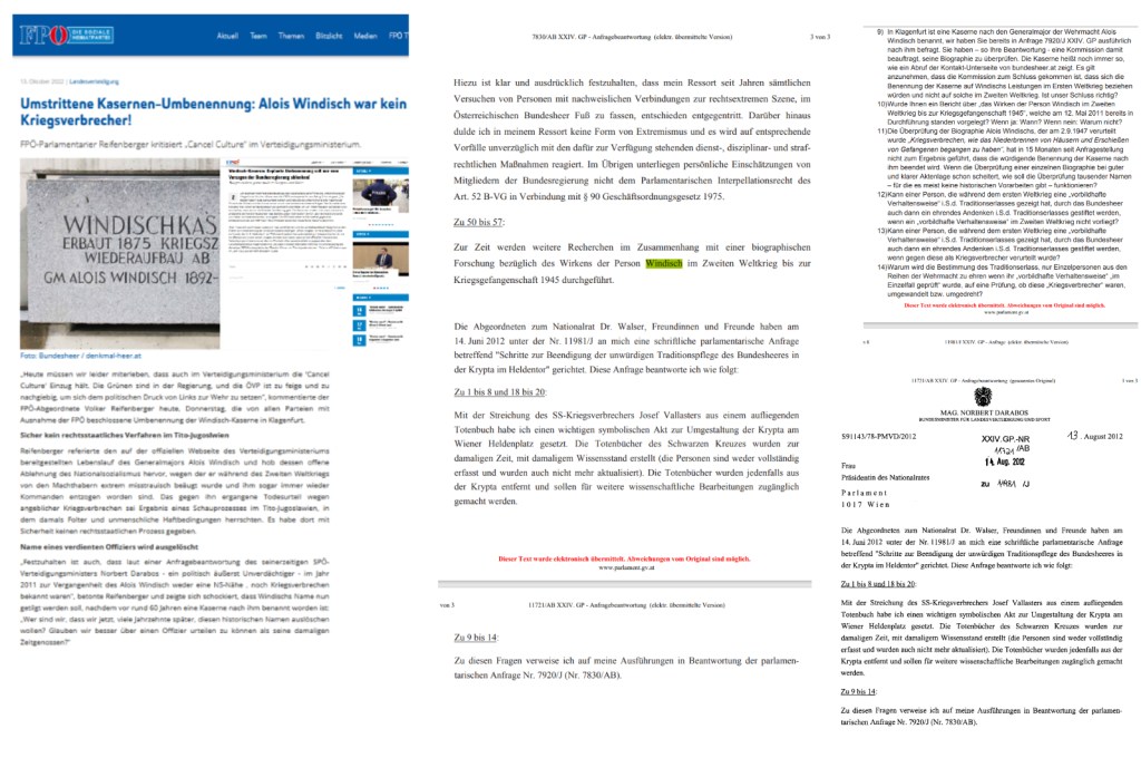 Name eines verdienten Offiziers wird ausgelöscht „Festzuhalten ist auch, dass laut einer Anfragebeantwortung des seinerzeitigen SPÖ-Verteidigungsministers Norbert Darabos – ein politisch äußerst Unverdächtiger – im Jahr 2011 zur Vergangenheit des Alois Windisch weder eine NS-Nähe , noch Kriegsverbrechen bekannt waren“, betonte Reifenberger