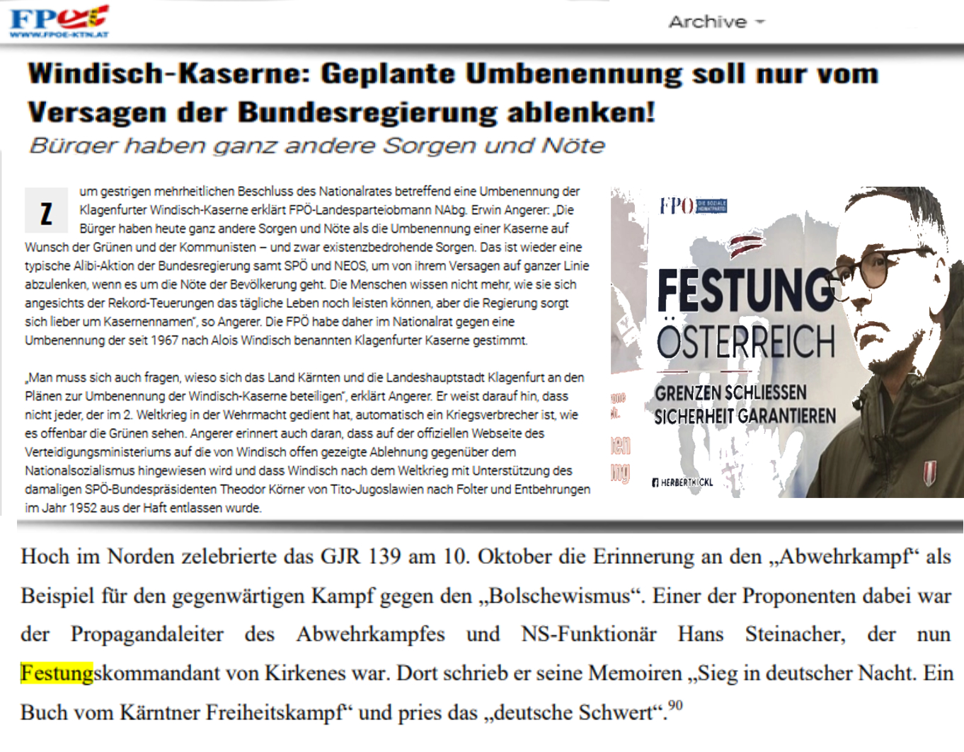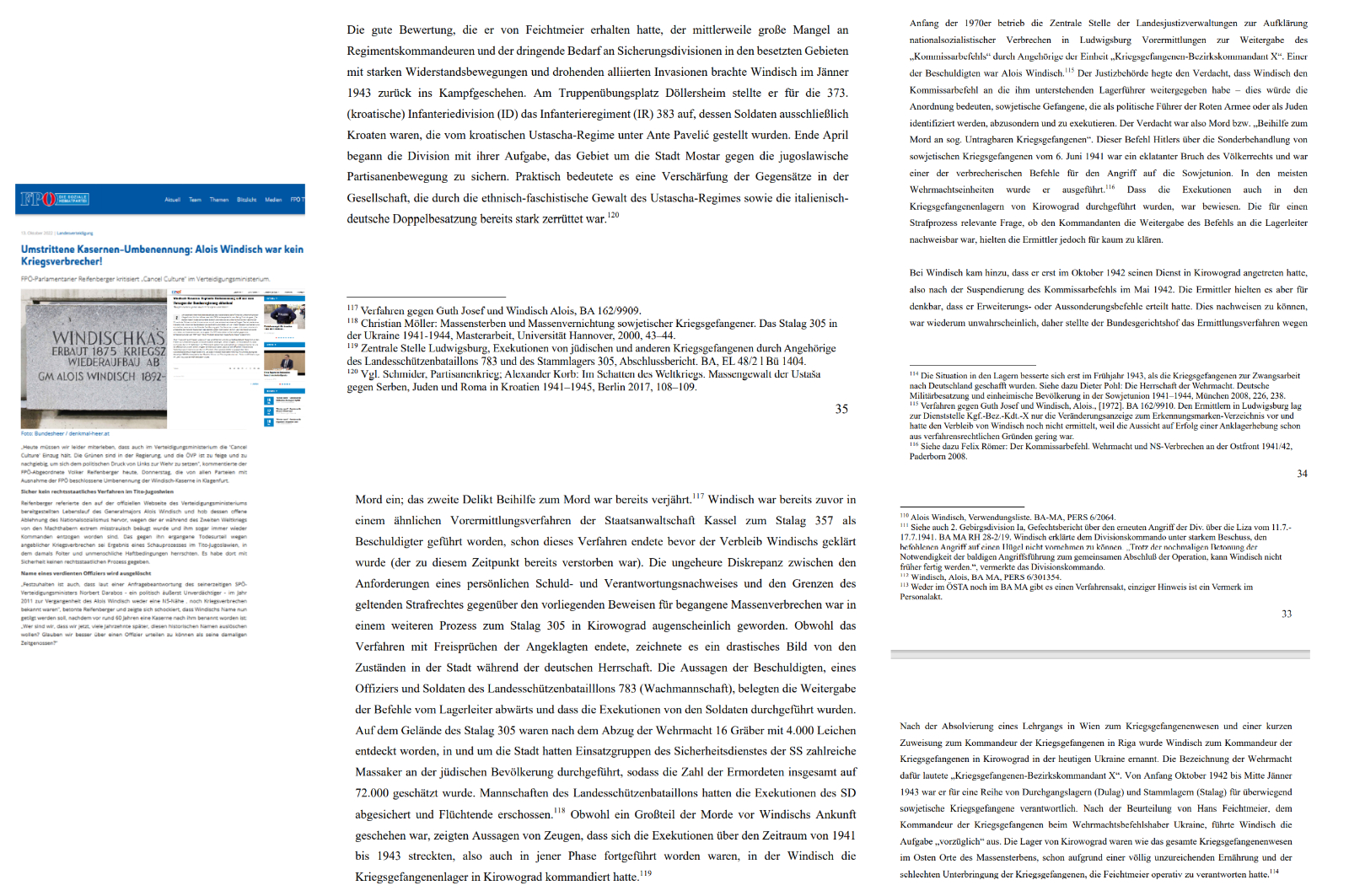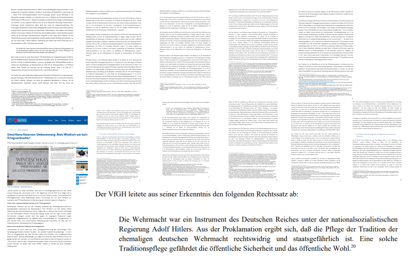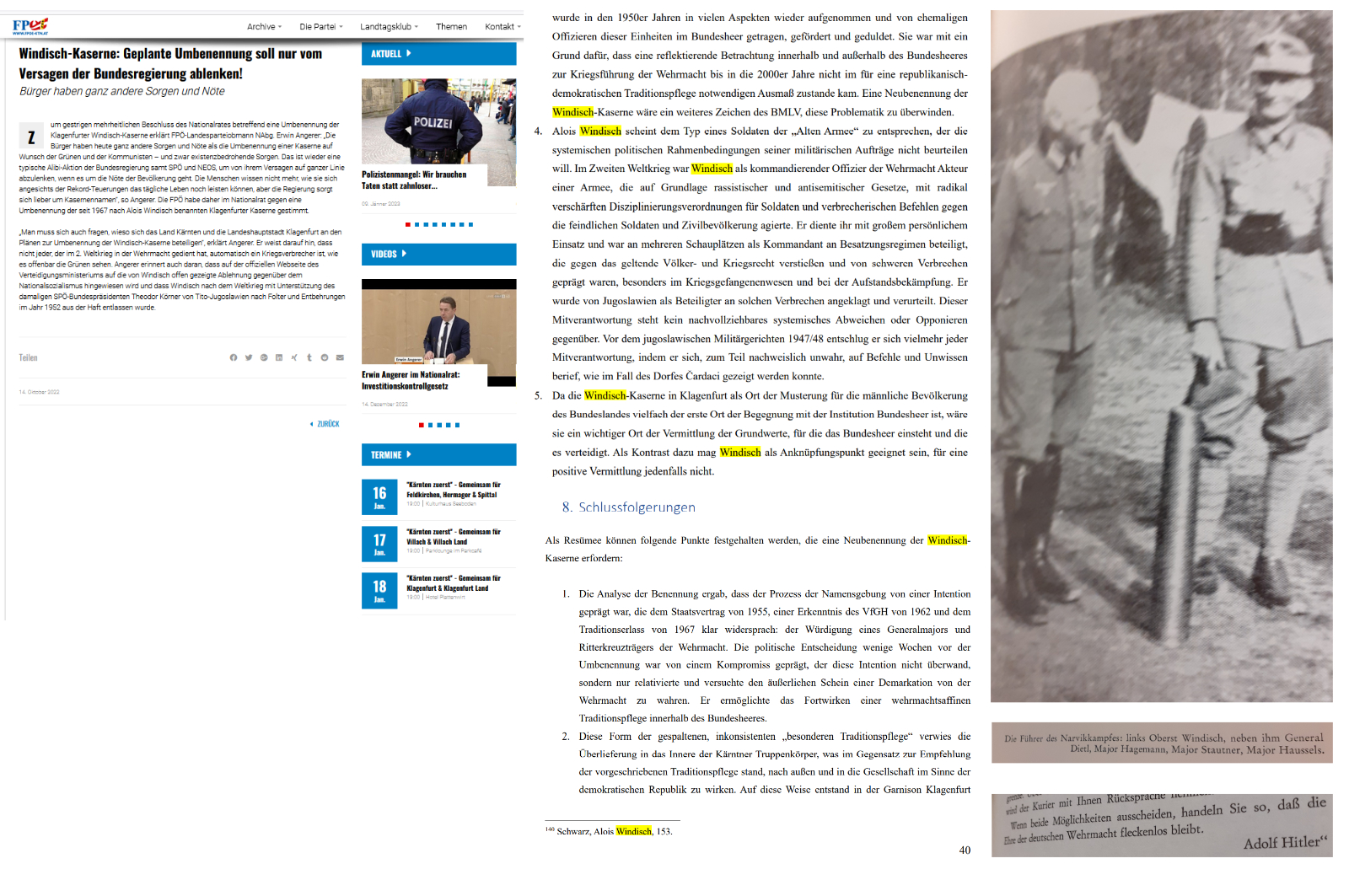 Name eines verdienten Offiziers wird ausgelöscht „Festzuhalten ist auch, dass laut einer Anfragebeantwortung des seinerzeitigen SPÖ-Verteidigungsministers Norbert Darabos – ein politisch äußerst Unverdächtiger – im Jahr 2011 zur Vergangenheit des Alois Windisch weder eine NS-Nähe , noch Kriegsverbrechen bekannt waren“, betonte Reifenberger