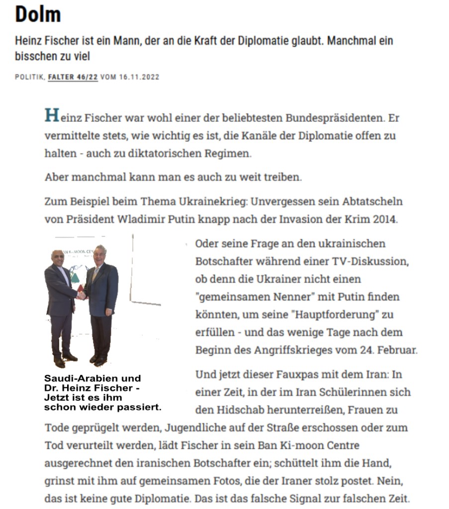 Ach, wäre es nur er, von der sogenannten österreichischen Staatsspitze, es müßte dieses Kapitel nicht geschrieben werden. Und dann gibt es beispielsweise diesen ehemaligen Präsidenten, der noch einmal, spätes Glück, eine Auszeichnung erfahren durfte, im November 2022, bei dem eingeschränkt werden muß, formal gehört er nicht mehr zur sogenannten österreichischen Staatsspitze, aber er selbst wird durch seine eifrigen Auftritte da und hier und wieder da und dort sich selbst noch zu dieser zählen