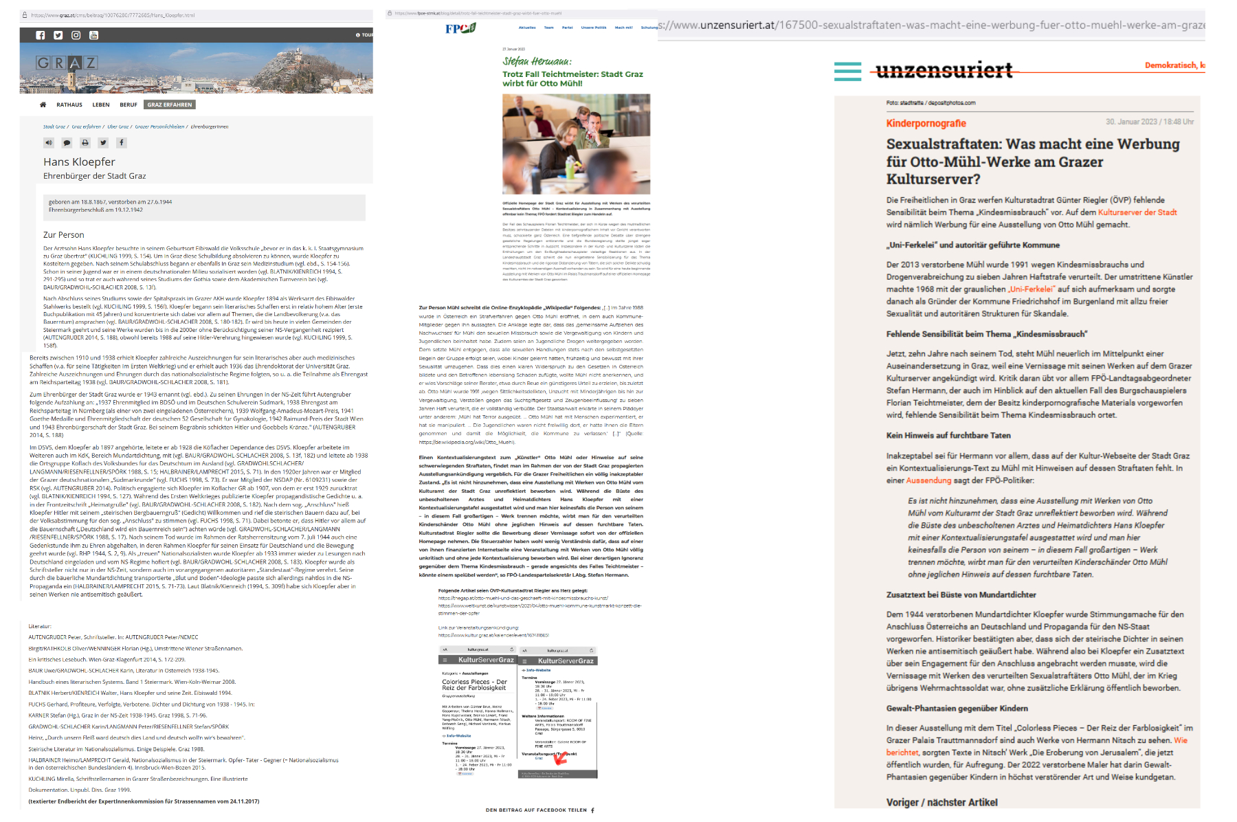 Einen Kontextualisierungstext zum „Künstler“ Otto Mühl oder Hinweise auf seine schwerwiegenden Straftaten, findet man im Rahmen der von der Stadt Graz propagierten Ausstellungsankündigung vergeblich. Für die Grazer Freiheitlichen ein völlig inakzeptabler Zustand. „Es ist nicht hinzunehmen, dass eine Ausstellung mit Werken von Otto Mühl vom Kulturamt der Stadt Graz unreflektiert beworben wird. Während die Büste des unbescholtenen Arztes und Heimatdichters Hans Kloepfer mit einer Kontextualisierungstafel ausgestattet wird und man hier keinesfalls die Person von seinem – in diesem Fall großartigen – Werk trennen möchte, wirbt man für den verurteilten Kinderschänder Otto Mühl ohne jeglichen Hinweis auf dessen furchtbare Taten. Kulturstadtrat Riegler sollte die Bewerbung dieser Vernissage sofort von der offiziellen Homepage nehmen. Die Steuerzahler haben wohl wenig Verständnis dafür, dass auf einer von ihnen finanzierten Internetseite eine Veranstaltung mit Werken von Otto Mühl völlig unkritisch und ohne jede Kontextualisierung beworben wird. Bei einer derartigen Ignoranz gegenüber dem Thema Kindesmissbrauch – gerade angesichts des Falles Teichtmeister – könnte einem speiübel werden“, so FPÖ-Landesparteisekretär LAbg. Stefan Hermann.