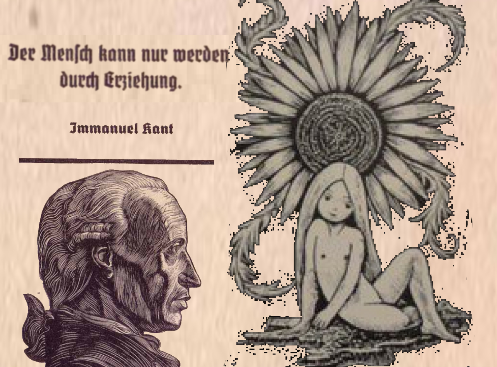 Und ein Holzschnitt dieses Kloepferlandkünstlers soll seinem illustrierten Kant beigestellt sein, der anschaulich illustriert, wie Kinder darzustellen sind, mit einer gar schönen Blüte, die gepflückt sein will, in der sich, so will es scheinen, die gesinnungsgemäße Sonne widerspiegelt, derart sind Kinder vorzuführen und also nicht so wie in der heutigen Internetzeit als mißbrauchte und geschändete Kinder, sondern als Kinder, die einladen zu …